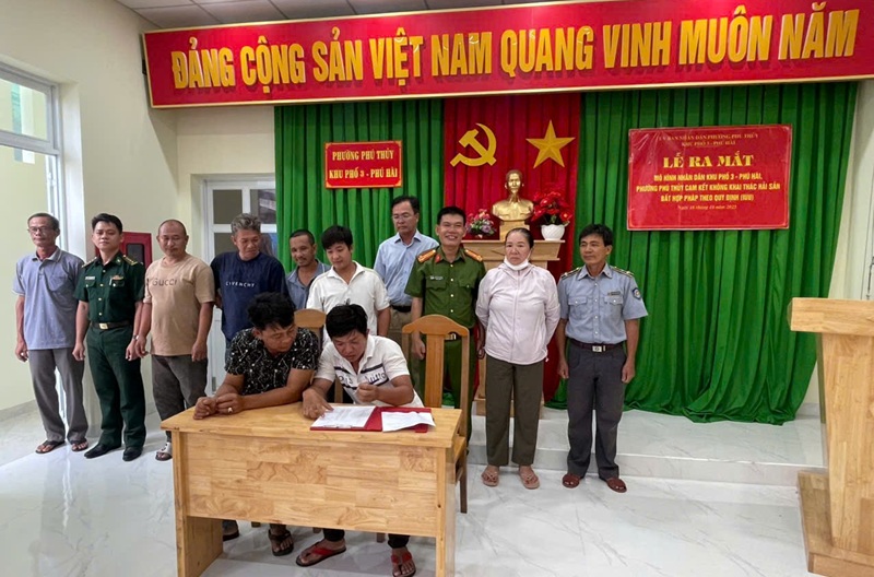 Lời phát biểu ngắn gọn mà sâu sắc ấy được hội trường đáp lại bằng những tràng pháo tay vang dội – như lời hứa chung của cả cộng đồng ngư dân trước biển cả quê hương. Ngay sau đó, bản cam kết “Không khai thác hải sản bất hợp pháp theo quy định (IUU)” được đại diện chính quyền, Công an phường, Ban điều hành khu phố và các chủ tàu, thuyền trưởng, thuyền viên đồng loạt ký kết trong không khí trang nghiêm và xúc động. Hàng chục bàn tay chai sạn, rám nắng đặt bút ký tên – từng nét chữ là một lời thề giữ biển, giữ nghề, giữ lấy danh dự của làng chài Phú Hài, phường Phú Thủy.