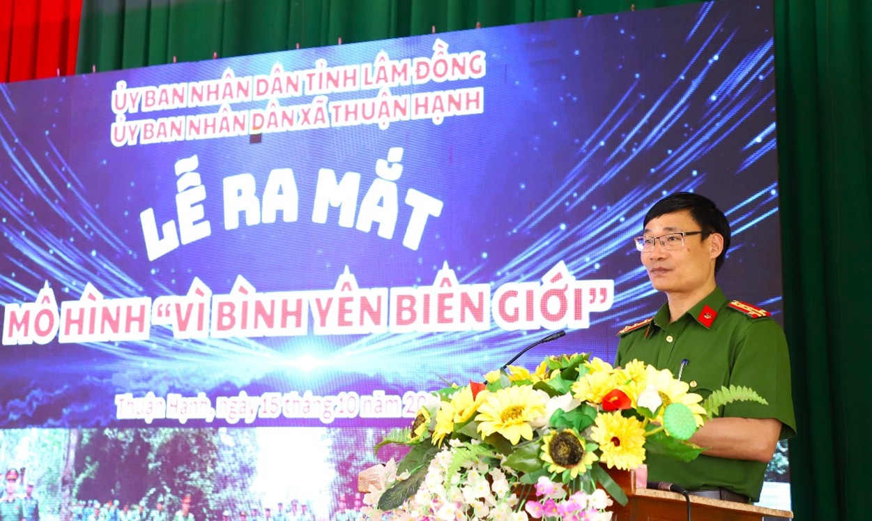 Đại tá Nguyễn Văn Dũng, Phó Giám đốc Công an tỉnh Lâm Đồng phát biểu tại buổi Lễ ra mắt mô hình “Vì bình yên biên giới”