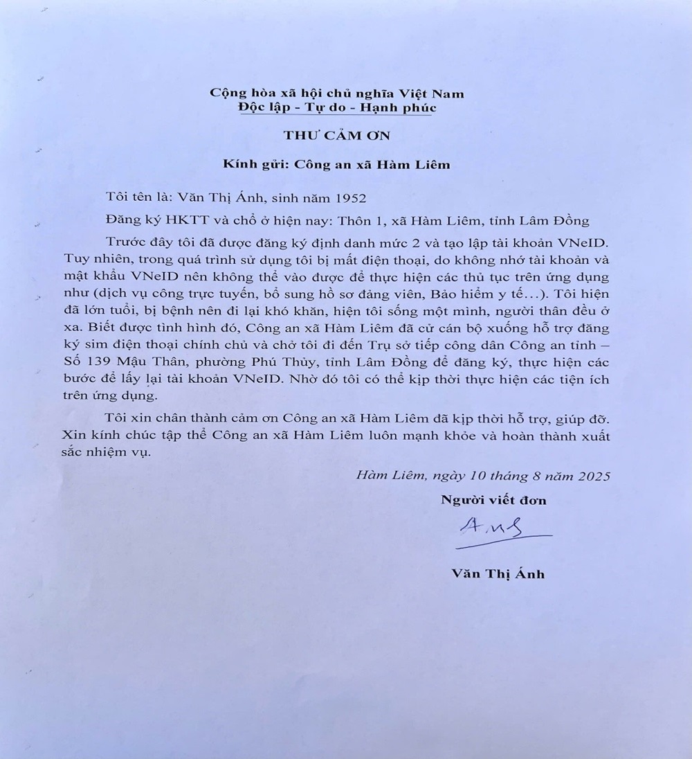 Nhờ vậy, bà Ánh đã sớm sử dụng lại tài khoản của mình và có thể tiếp tục giải quyết các nhu cầu hành chính trực tuyến. Cảm động trước sự tận tình đó, bà viết trong thư: “Tôi xin chân thành cảm ơn Công an xã Hàm Liêm đã kịp thời hỗ trợ, giúp đỡ. Xin kính chúc tập thể Công an xã Hàm Liêm luôn mạnh khỏe và hoàn thành xuất sắc nhiệm vụ.”