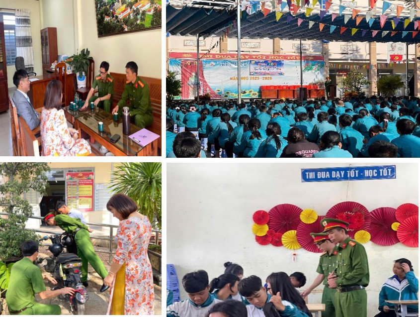 Ngay sau phần tuyên truyền, chương trình phối hợp giữa nhà trường và Công an xã được triển khai thông qua hoạt động kiểm tra thực tế. Đoàn liên ngành tiến hành kiểm tra việc chấp hành quy định khi sử dụng xe đạp điện của học sinh, đồng thời kiểm tra công tác bảo đảm an ninh, trật tự trong nhà trường.