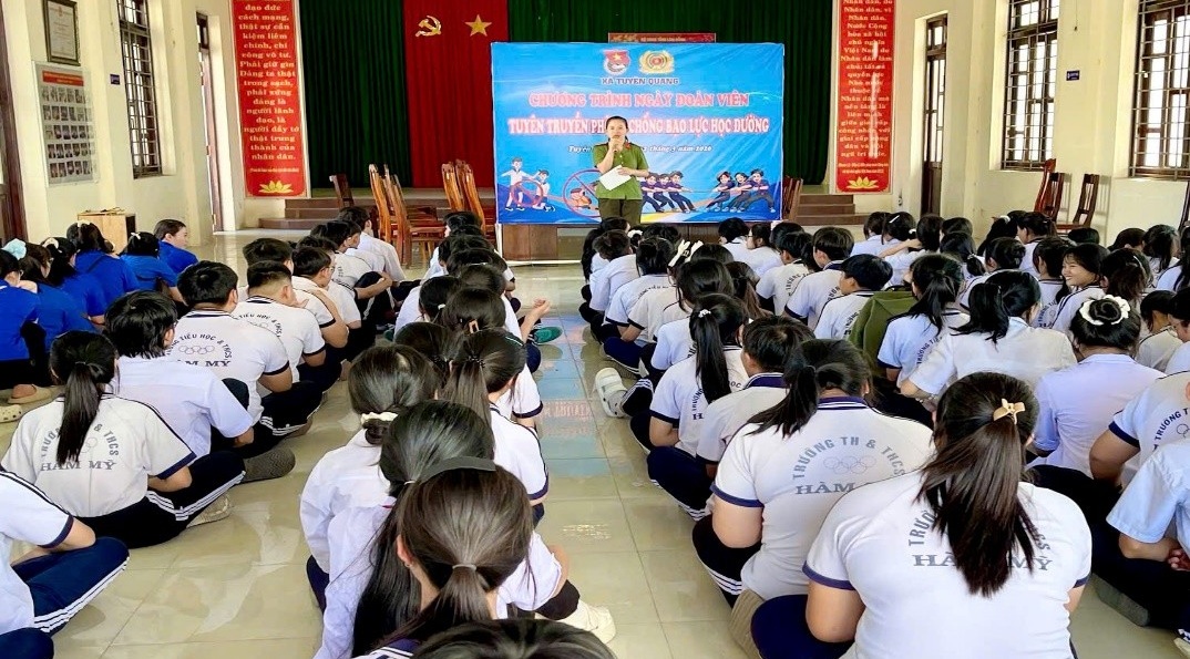 Ngày 22/3/2026, Công an xã đã phối hợp với Trường Tiểu học và Trung học cơ sở Hàm Mỹ, Xã Đoàn Tuyên Quang tổ chức tuyên truyền pháp luật phòng, chống bạo lực học đường cho 250 đoàn viên, thanh niên và học sinh của nhà trường.