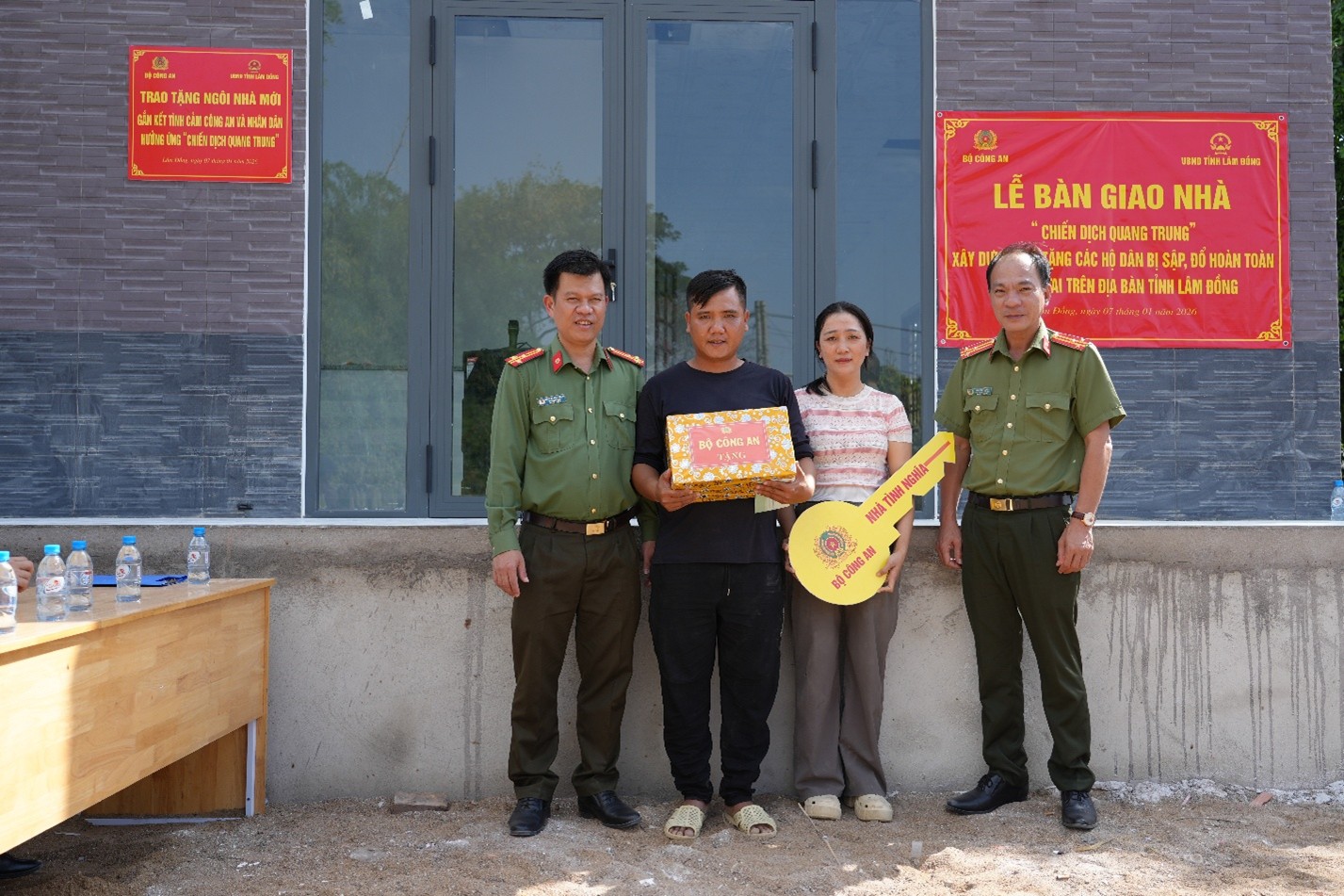 Trong lễ bàn giao nhà mới, thừa ủy quyền của lãnh đạo Bộ Công an và lãnh đạo Công an tỉnh, Thượng tá Trần Quang Trung – Trưởng phòng Công tác chính trị Công an tỉnh Lâm Đồng đã trao quà của Bộ Công an gửi tặng cho các hộ dân bị thiệt hại nặng do mưa lũ; trong đó, có gia đình ông Nguyễn Dương Quốc Thái. Dịp này, Phòng Công tác chính trị và Công an phường Hàm Thắng còn tặng thêm cho gia đình những phần quà thiết thực để phục vụ đời sống hằng ngày, động viên gia đình sớm an cư trong ngôi nhà mới.
