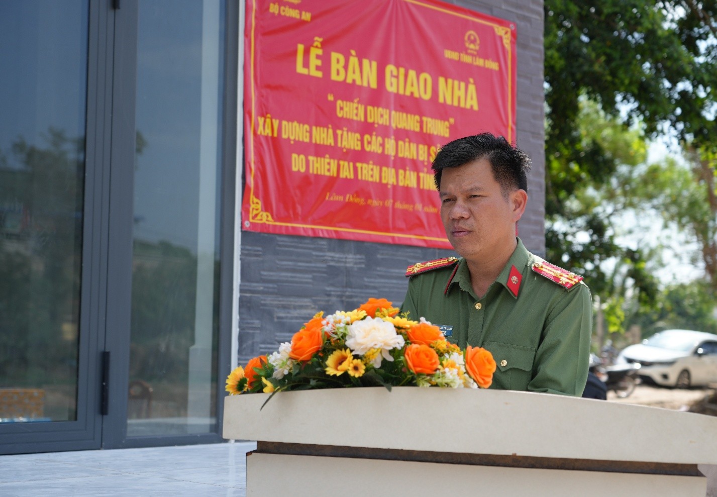 Thượng tá Trần Quang Trung – Trưởng phòng Công tác chính trị Công an tỉnh Lâm Đồng chỉ đạo tại lễ bàn giao nhà