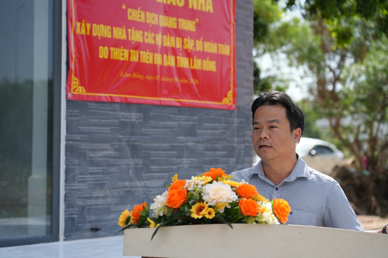 Phát biểu tại buổi lễ, Thượng tá Trần Quang Trung – Trưởng phòng Công tác chính trị Công an tỉnh Lâm Đồng đã gửi lời cảm ơn đến sự quan tâm, giúp đỡ của lãnh đạo Trung đoàn Cảnh sát Cơ động Đông Nam Bộ và Trung đoàn Cảnh sát Cơ động Tây Nguyên – Bộ Công an đã hỗ trợ nhân lực, huy động cán bộ, chiến sĩ đơn vị, phối hợp Công an tỉnh xây dựng, sửa chữa một số căn nhà bị thiệt hại do mưa lũ trên địa bàn; đồng chí cho biết, căn nhà được khánh thành hôm nay là 1 trong 20 căn, đã được Công an tỉnh tổ chức bàn giao trước đó cho người dân và đưa vào sử dụng. Đồng chí nhấn mạnh, Công an toàn tỉnh đang tập trung cao độ, quyết tâm “thần tốc hơn nữa”, dồn sức về đích, phấn đấu đến ngày 09/01 sẽ bàn giao 100% số lượng nhà được hỗ trợ xây mới trên địa bàn, đáp ứng yêu cầu tiến độ đặt ra trong Công điện của Thủ tướng Chính phủ.