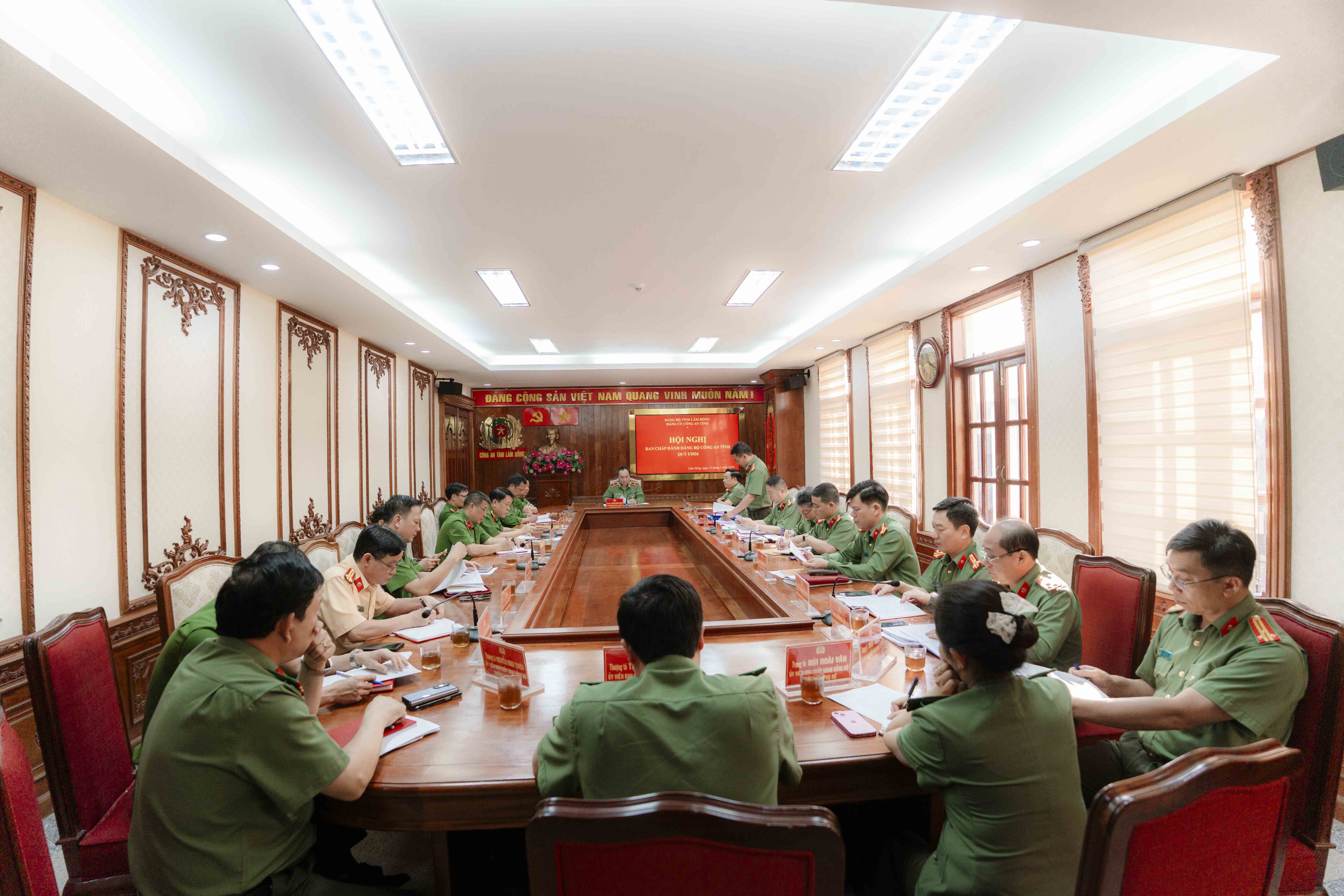 Nhằm tiếp tục giữ vững an ninh trật tự trên địa bàn, Ban Chấp hành Đảng bộ đã thống nhất cao phương hướng, nhiệm vụ trọng tâm quý II/2026. Trong đó, chỉ đạo các đơn vị, địa phương tập trung thực hiện các giải pháp mũi nhọn: Chủ động phòng ngừa, đấu tranh, trấn áp mạnh mẽ các loại tội phạm, nhất là tội phạm công nghệ cao, ma túy và băng nhóm hình sự; tập trung triển khai các phương án bảo đảm tuyệt đối an ninh trật tự dịp Giỗ Tổ Hùng Vương và Lễ 30/4. Đồng thời, Đảng ủy nhấn mạnh yêu cầu đẩy nhanh tiến độ Đề án 06 của Chính phủ gắn liền với công tác chuyển đổi số toàn diện trong Công an tỉnh; siết chặt kỷ cương điều lệnh và làm tốt công tác giáo dục chính trị tư tưởng.