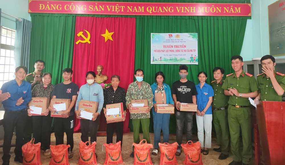 Tiếp nối chương trình, thể hiện tinh thần “Vì Nhân dân phục vụ”, đoàn viên thanh niên Công an xã đã tích cực vận động nguồn lực để trao tặng 30 phần quà thiết thực cho 30 hộ gia đình Chơ Ro có hoàn cảnh khó khăn tại thôn 4, xã Trà Tân. Mỗi phần quà trị giá 300.000 đồng, bao gồm 01 bao gạo, 01 thùng mì tôm và 50.000 đồng tiền mặt. Những món quà tuy nhỏ nhưng chứa đựng tấm lòng và sự sẻ chia kịp thời, tiếp thêm động lực để bà con tiếp tục lao động, sản xuất và vươn lên trong cuộc sống.