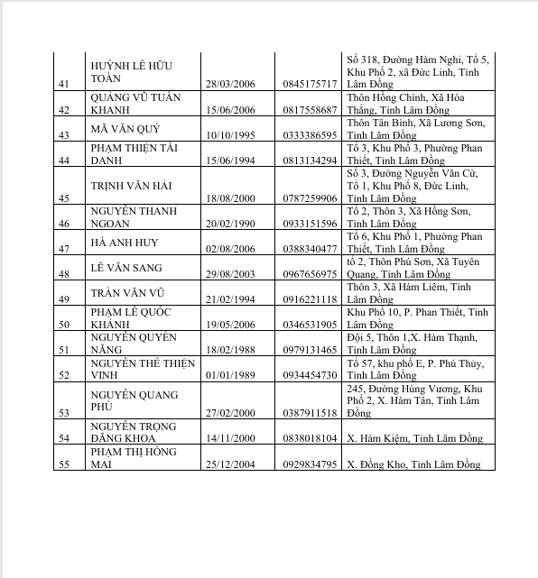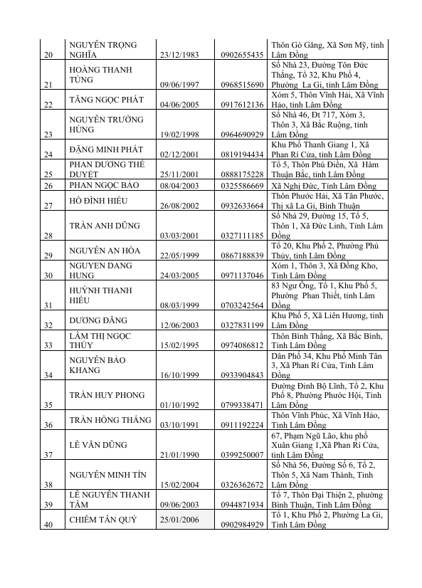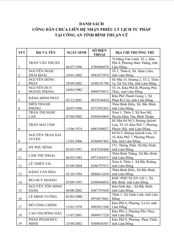 Danh sách công dân chưa liên hệ nhận phiếu lý lịch tư pháp tại Công an tỉnh Bình Thuận (cũ)