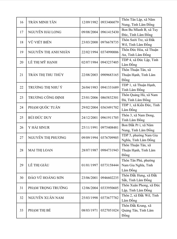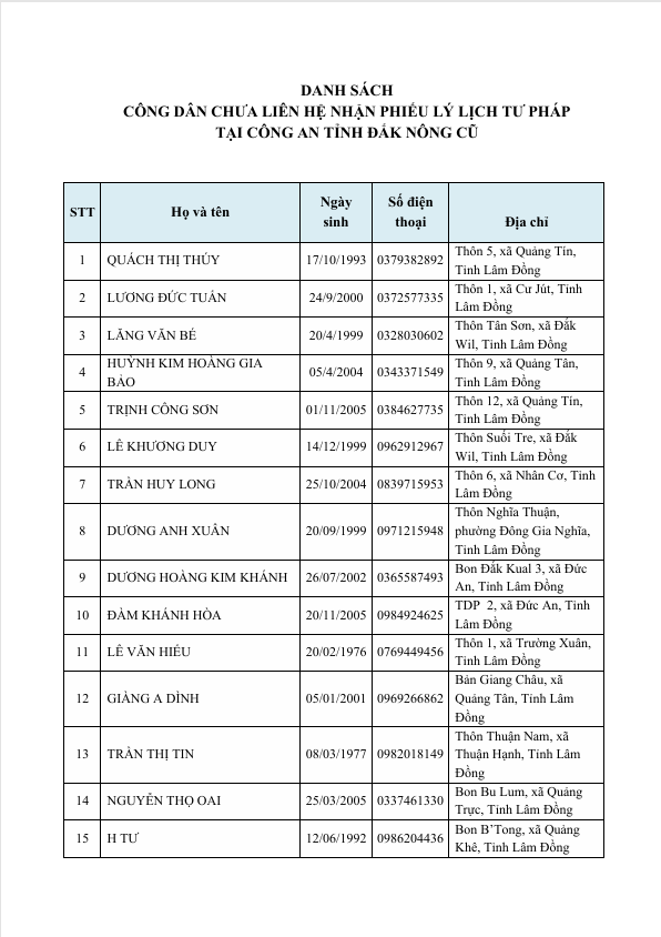 Danh sách công dân chưa liên hệ nhận phiếu lý lịch tư pháp tại Công an tỉnh Đắk Nông (cũ)