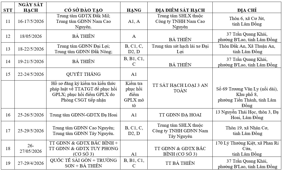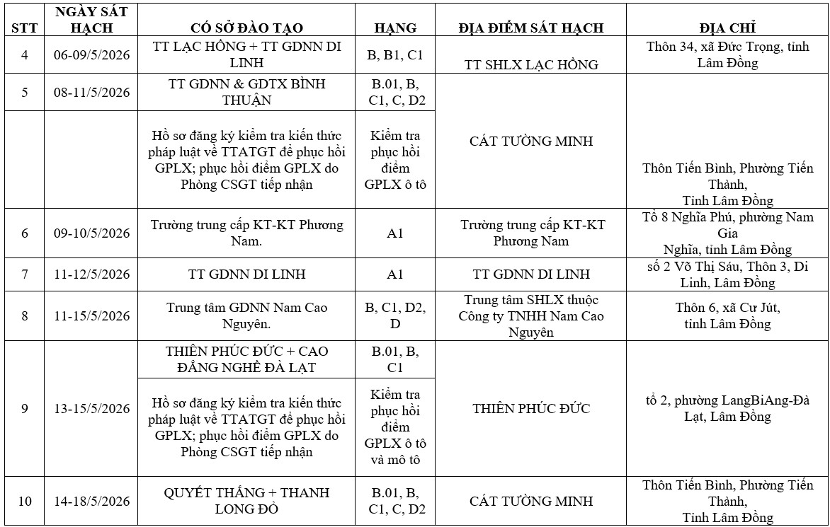 Phòng Cảnh sát giao thông - Công an tỉnh Lâm Đồng thông báo để nhân dân, học viên, thí sinh tự do có nhu cầu đăng ký sát hạch và kiểm tra kiến thức pháp luật về TTATGT để phục hồi GPLX; phục hồi điểm GPLX trên địa bàn tỉnh Lâm Đồng biết tham gia dự thi. Đề nghị các trung tâm đào tạo, các trung tâm GDNN - GDTX căn cứ lịch sát hạch chuẩn bị tốt nhất các điều kiện cơ sở vật chất, sân bãi để các kỳ sát hạch và kiểm tra kiến thức pháp luật về TTATGT phục hồi điểm GPLX diễn ra đúng quy định.