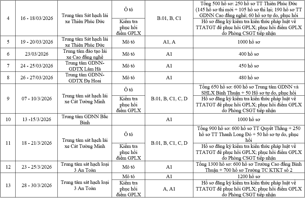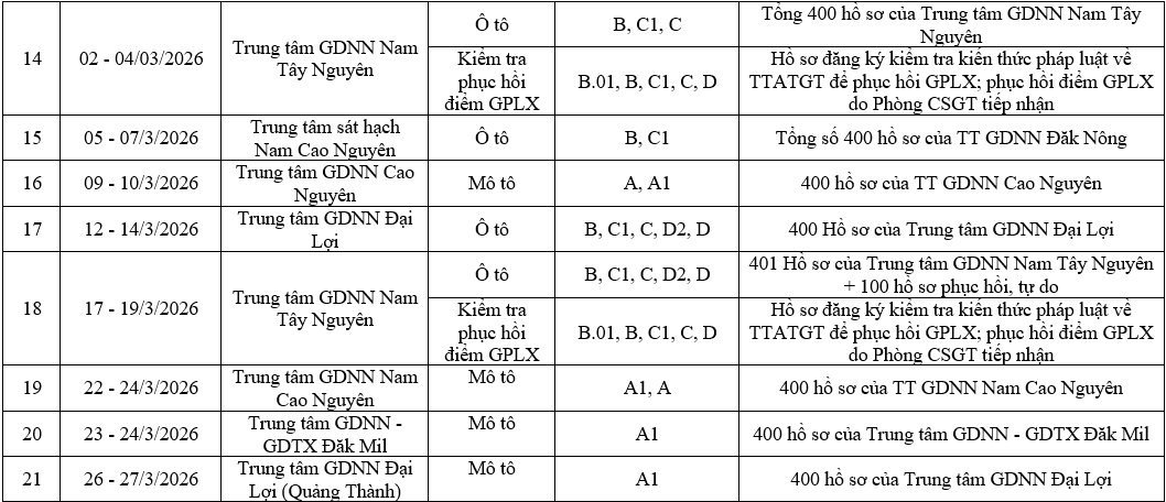 Phòng Cảnh sát giao thông, Công an tỉnh Lâm Đồng thông báo để nhân dân, học viên, thí sinh tự do có nhu cầu đăng ký sát hạch và kiểm tra kiến thức pháp luật về TTATGT để phục hồi GPLX; phục hồi điểm GPLX trên địa bàn tỉnh Lâm Đồng biết tham gia dự thi. Đề nghị các trung tâm đào tạo, các trung tâm GDNN - GDTX căn cứ lịch sát hạch chuẩn bị tốt nhất các điều kiện cơ sở vật chất, sân bãi để các kỳ sát hạch và kiểm tra kiến thức pháp luật về TTATGT phục hồi điểm GPLX diễn ra đúng quy định./.