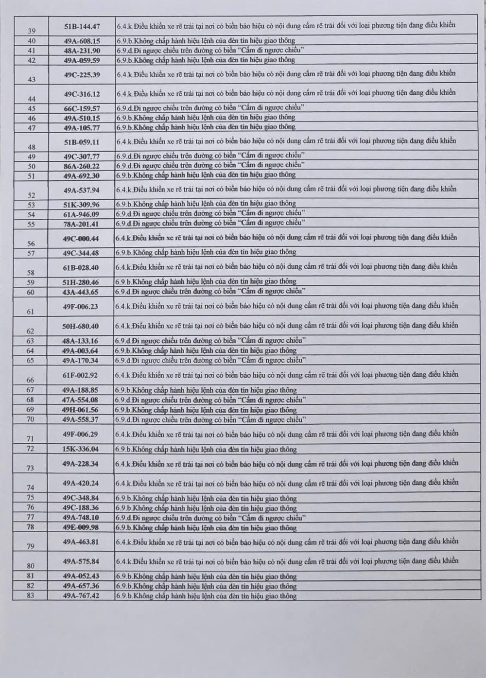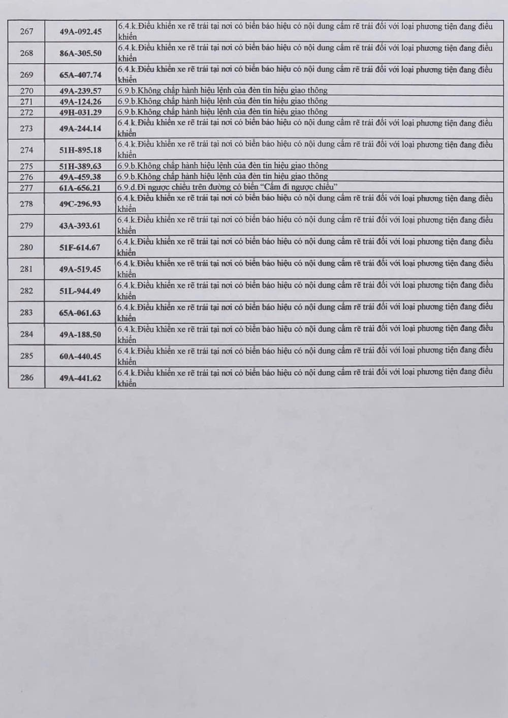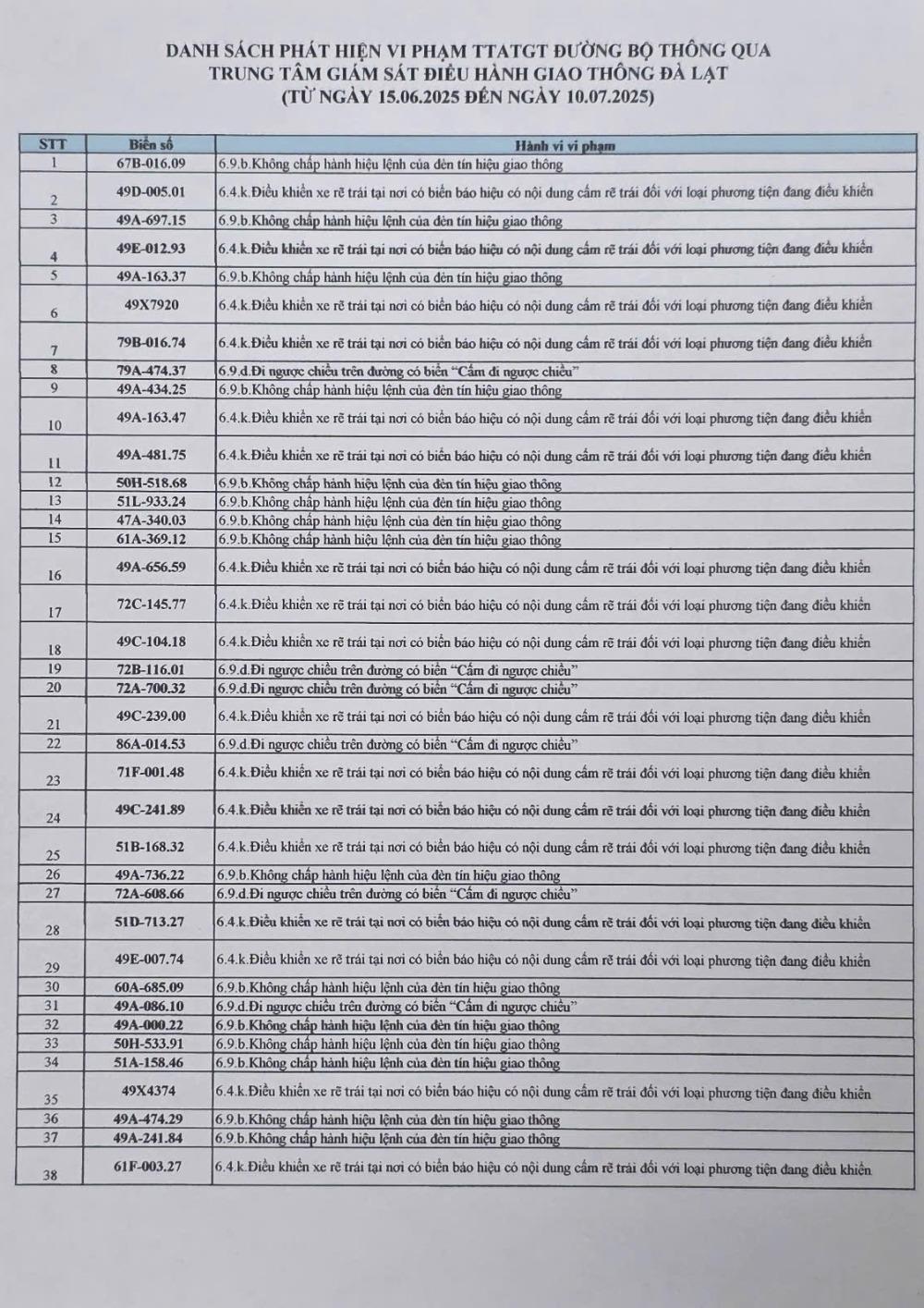 Căn cứ kết quả ghi nhận phương tiện vi phạm giao thông đường bộ trên địa bàn thành phố Đà Lạt - tỉnh Lâm Đồng từ ngày 15/6/2025 đến ngày 10/7/2025. Phòng Cảnh sát Giao thông thông báo danh sách phương tiện, thời gian và hành vi cụ thể như sau: