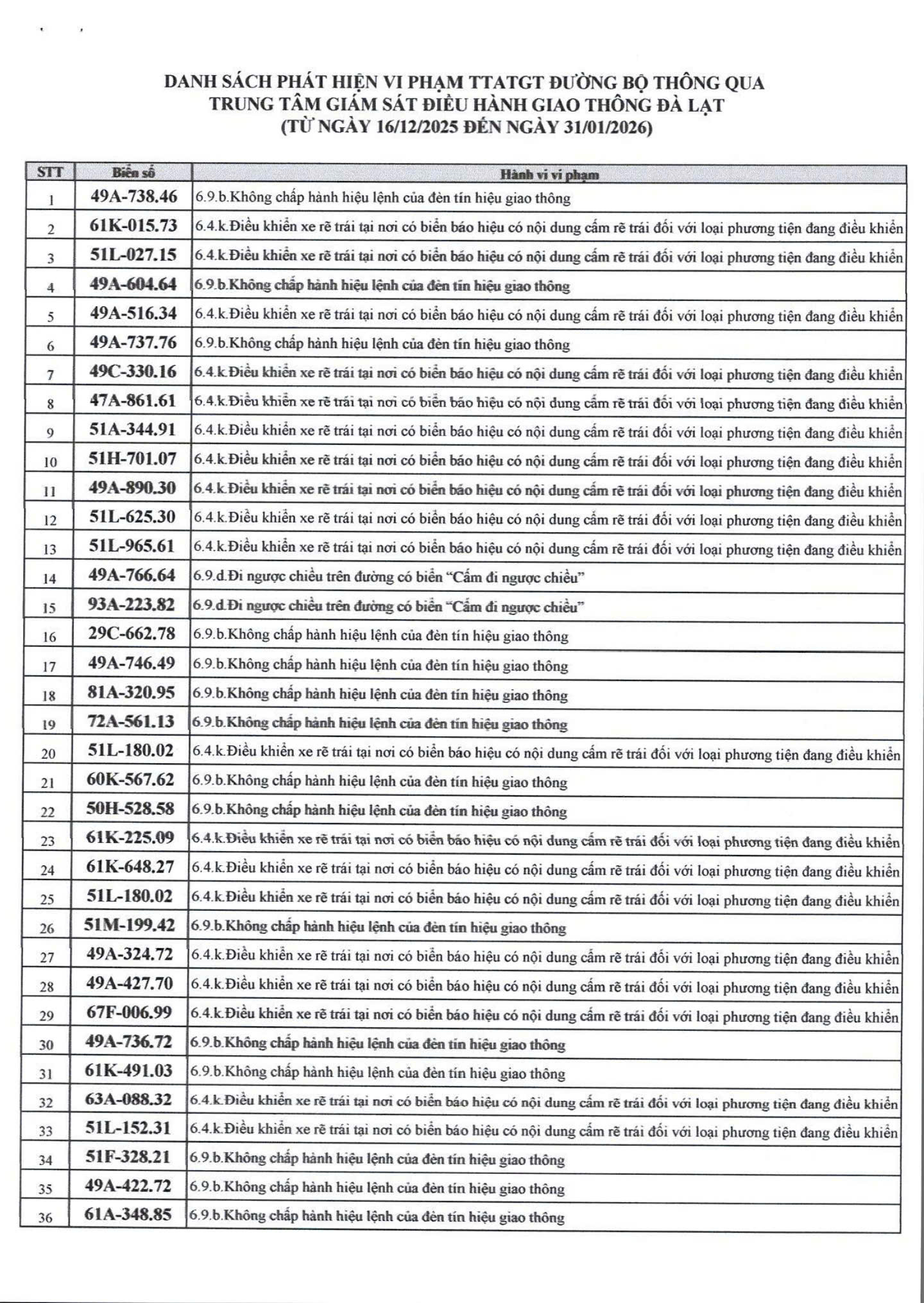 Căn cứ kết quả ghi nhận phương tiện vi phạm giao thông đường bộ từ ngày 16/12/2025 đến ngày 31/01/2026. Phòng Cảnh sát Giao thông - Công an tỉnh Lâm Đồng thông báo danh sách phương tiện, thời gian và hành vi cụ thể như sau: Phòng Cảnh sát giao thông