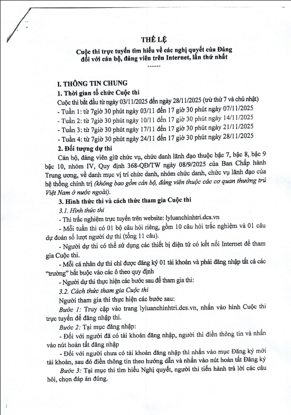 Thông báo Thông báo thể lệ cuộc thi trực tuyến tìm hiểu về các Nghị quyết của Đảng đối với cán bộ, đảng viên trên internet, lần thứ nhất Your browser does not support the audio element.   17/11/2025 10:55 |   106 |  Công an tỉnh Lâm Đồng thông báo thể lệ cuộc thi trực tuyến tìm hiểu về các Nghị quyết của Đảng đối với cán bộ, đảng viên trên internet, lần thứ nhất Phòng Tham mưu