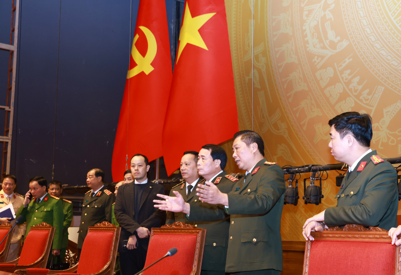 Đại tá Đỗ Xuân Tiệp, Phó Tư lệnh Bộ Tư lệnh Cảnh vệ báo cáo Thứ trưởng Lê Quốc Hùng về phương án bố trí lực lượng và các điều kiện bảo đảm an ninh, an toàn tại khu vực Hội trường.