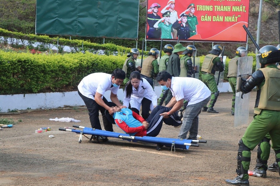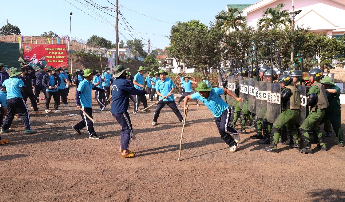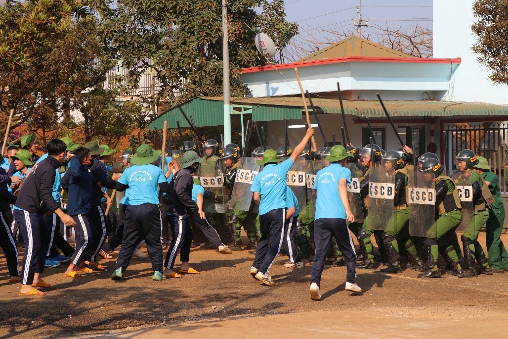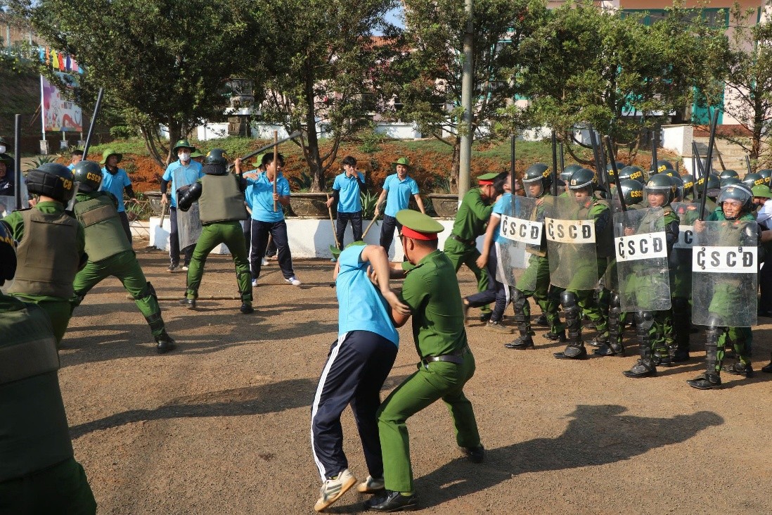 Tình huống giả định được xây dựng sát với thực tế khi một số học viên tụ tập đông người, có hành vi gây rối, kích động, đập phá tài sản, phá cổng và có ý định bỏ trốn. Trước diễn biến phức tạp, lực lượng tại chỗ đã nhanh chóng triển khai phương án, tổ chức lực lượng, phương tiện kiểm soát tình hình, không để xảy ra hậu quả nghiêm trọng.