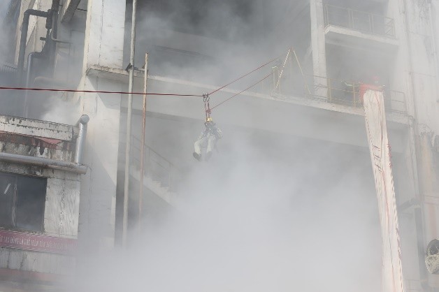 Sử dụng cầu dây nghiêng di chuyển công nhân bị mắc kẹt trong đám cháy
