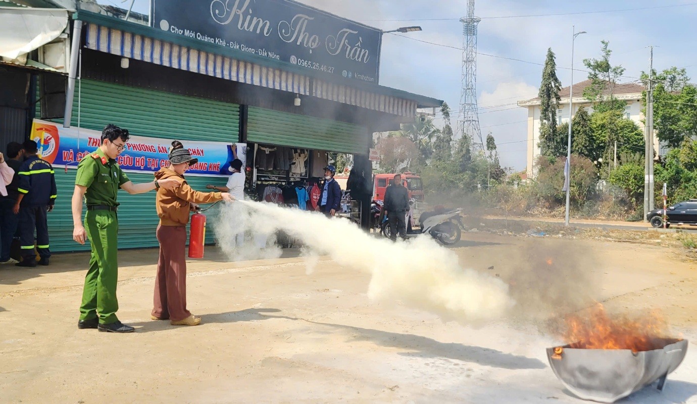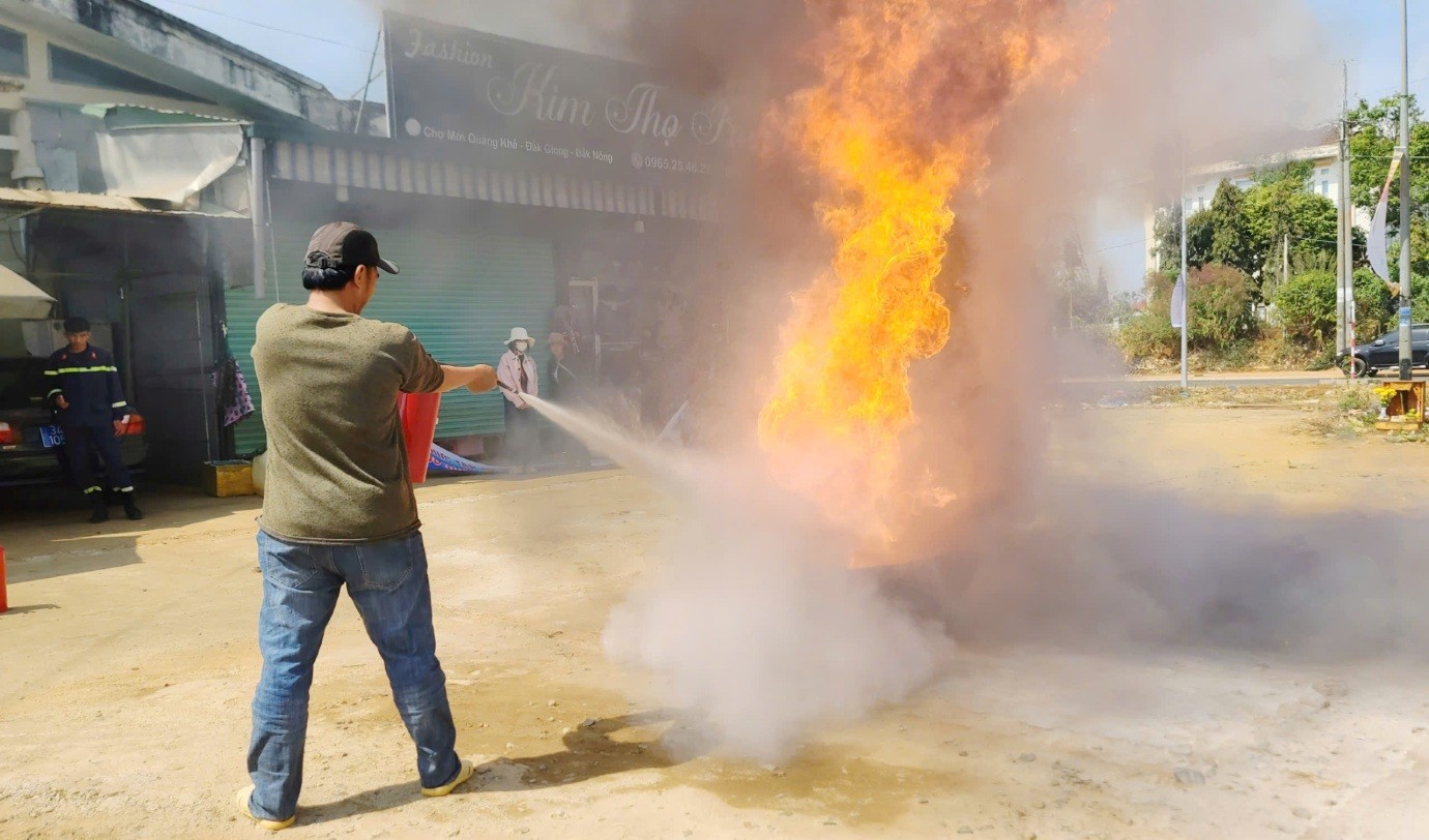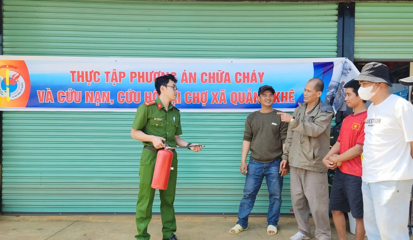 Trước khi bước vào diễn tập thực binh, cán bộ, chiến sĩ đã trực tiếp hướng dẫn bà con tiểu thương và người dân cách phân biệt, sử dụng các loại bình chữa cháy xách tay.