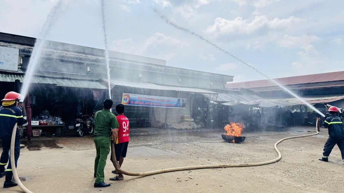 Trong tình huống giả định đám cháy lan rộng, lực lượng Cảnh sát PCCC chuyên nghiệp (Phòng Cảnh sát PCCC và CNCH) phối hợp với Công an xã và lực lượng dân phòng triển khai đội hình chữa cháy bằng vòi rồng áp lực cao nhằm khống chế và ngăn chặn cháy lan.