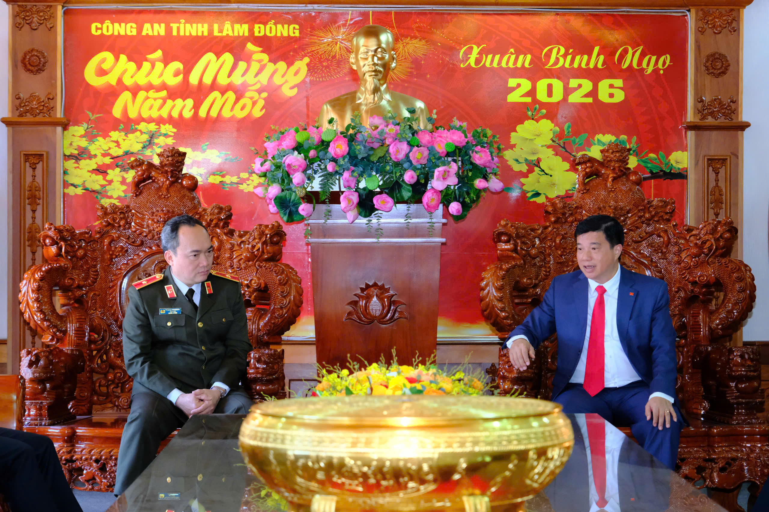 Đồng chí Bùi Thắng, Phó Bí thư tỉnh ủy và đồng chí Đinh Văn Tuấn, Phó Chủ tịch UBND tỉnh Lâm Đồng thăm chúc tết Công an tỉnh Lâm Đồng