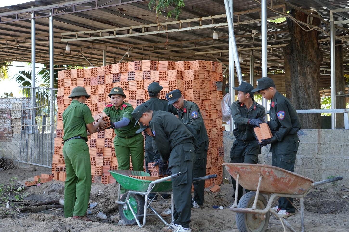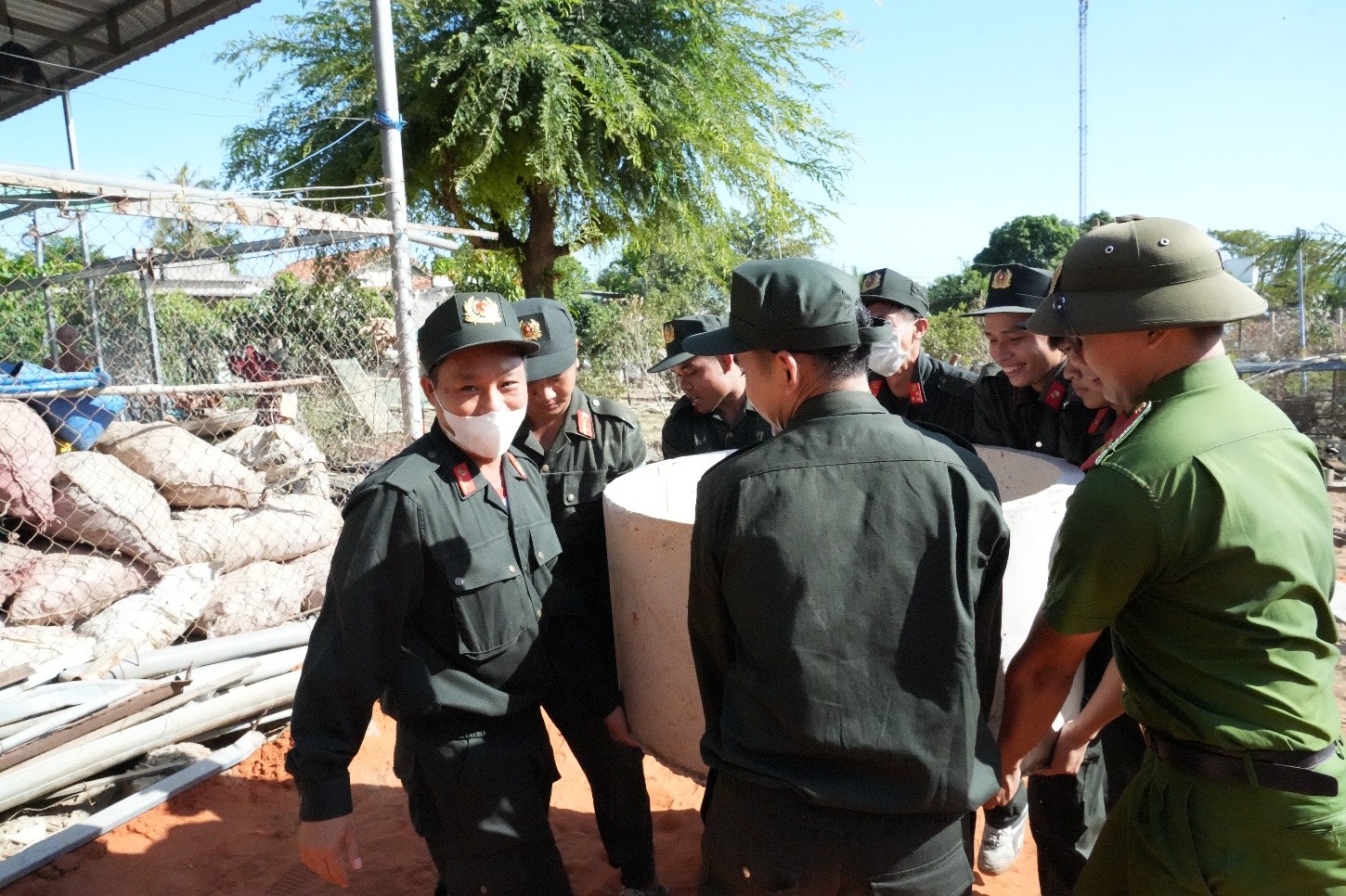 Trong ngày đầu, các tổ công tác tiếp nhận 3 công trình; bố trí nhân lực, phối hợp Công an địa phương tổ chức điểm tập kết vật tư, phương tiện phục vụ thi công; phân loại, vận chuyển vật liệu; tháo dỡ các cấu kiện xuống cấp. Tại một số công trình có lối đi dân sinh chật hẹp, phương tiện cơ giới khó tiếp cận, cán bộ, chiến sĩ đã dùng sức người trung chuyển nhiều lượt vật tư nặng như ống bê tông, cát, đất đá, gạch, sắt thép vào đúng vị trí tập kết, bảo đảm tiến độ.