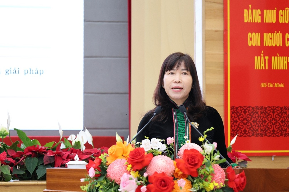 Đồng chí Hà Thị Hạnh, Ủy viên Ban Thường vụ Tỉnh ủy, Phó Chủ tịch UBMTTQ Việt Nam tỉnh, trình bày chuyên đề “Quán triệt một số nội dung Chương trình hành động của UBMTTQ Việt Nam tỉnh thực hiện Nghị quyết Đại hội”