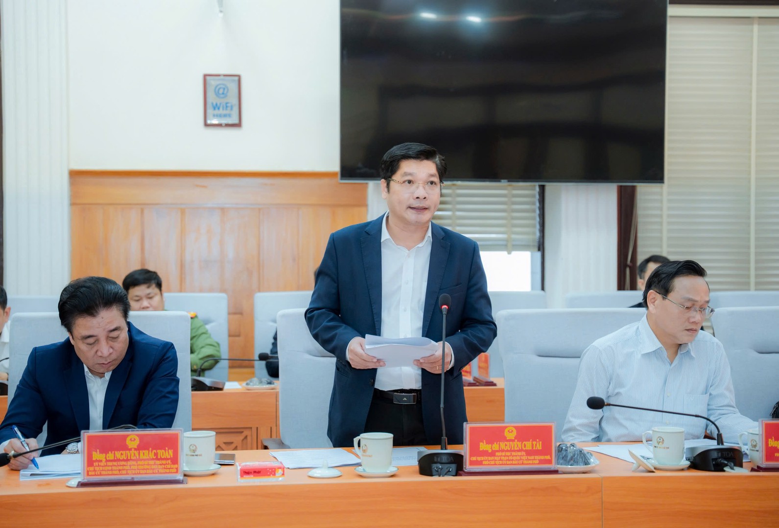 Đồng chí Nguyễn Chí Tài, Phó Bí thư Thành ủy, Chủ tịch Ủy ban Mặt trận Tổ quốc Việt Nam thành phố Huế trình bày báo cáo tại buổi làm việc.