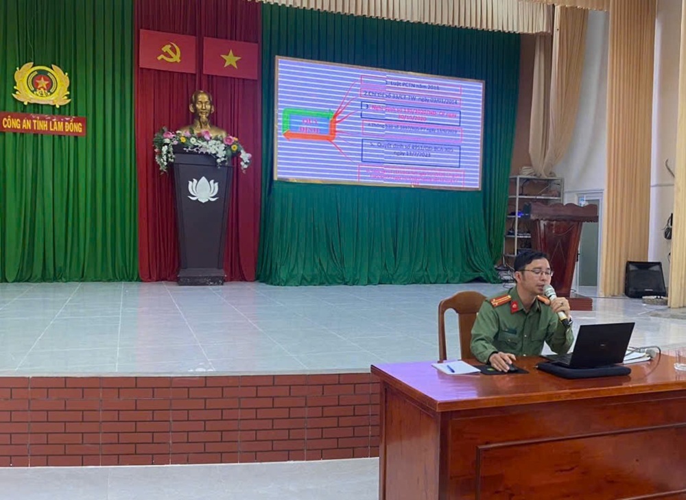 Báo cáo viên của Thanh tra Công an tỉnh trình bày các nội dung công tác tiếp công dân, giải quyết khiếu nại, tố cáo, kiến nghị, phản ánh và kiểm soát, kê khai tài sản thu nhập trong Công an Nhân dân