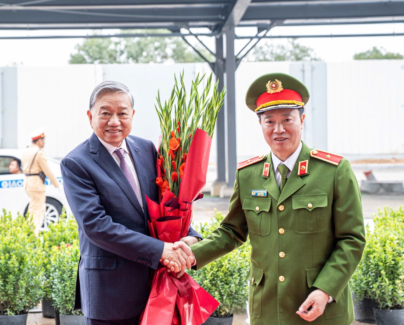 Thiếu tướng Nguyễn Ngọc Cương tặng hoa chào mừng Tổng Bí thư Tô Lâm tới thăm và làm việc tại Trung tâm.