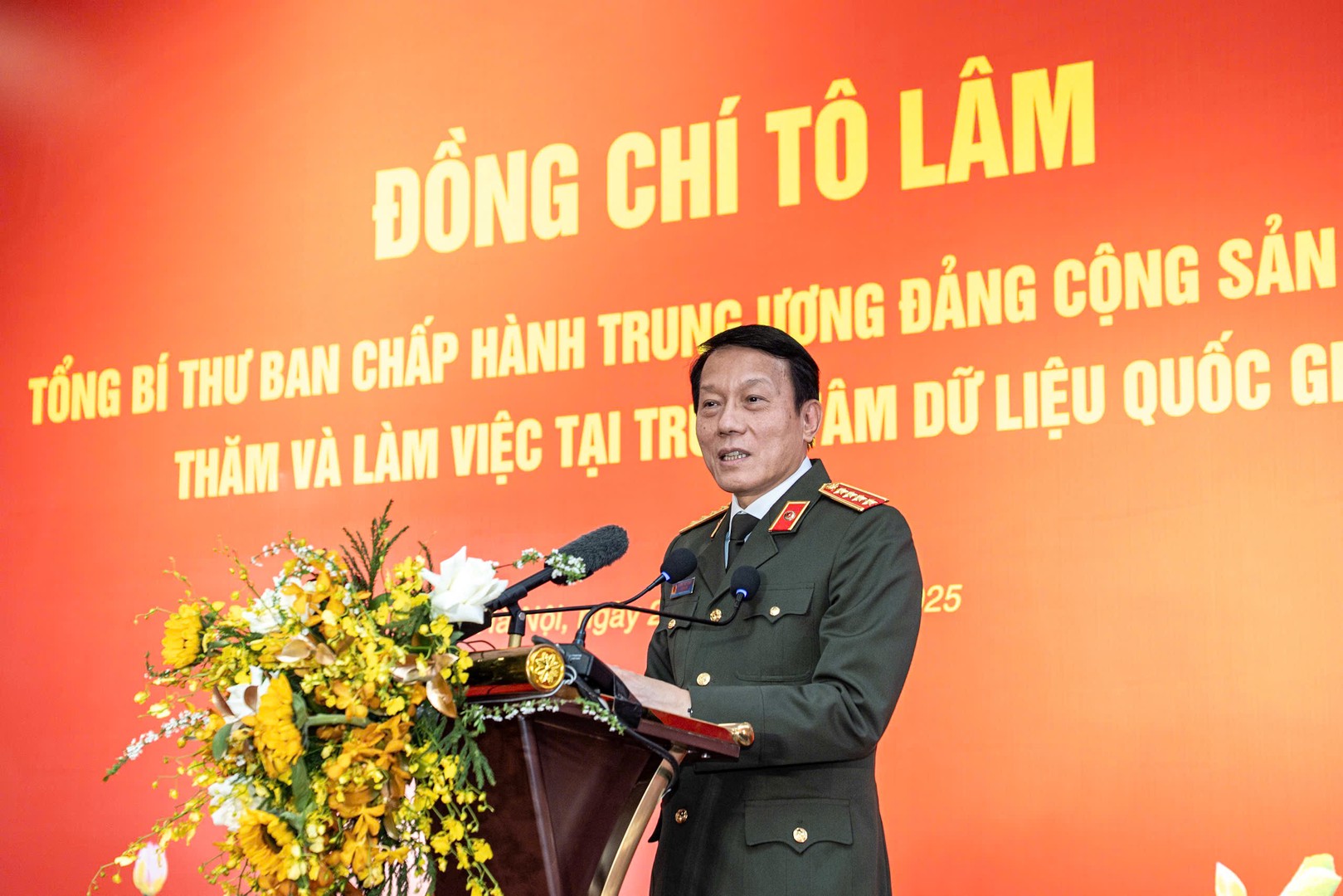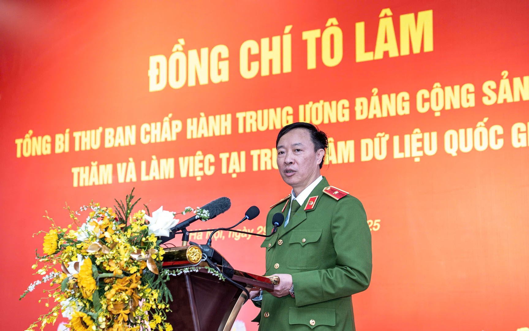 Tại Trung tâm, Tổng Bí thư Tô Lâm và Đoàn công tác đã nghe Thiếu tướng Nguyễn Ngọc Cương báo cáo tóm tắt quá trình xây dựng và kết quả hoạt động bước đầu của Trung trâm Dữ liệu Quốc gia. Theo đó, Trung tâm Dữ liệu Quốc gia được thành lập và chính thức ra mắt vào ngày 25/2/2025. Đây là bước đột phá quan trọng, đưa Việt Nam lần đầu tiên có một đơn vị chuyên trách thực hiện chức năng quản lý, điều phối Nhà nước về dữ liệu. Trung tâm được xác định đóng vai trò then chốt, là “bộ não” và “trái tim” của quá trình chuyển đổi số quốc gia.