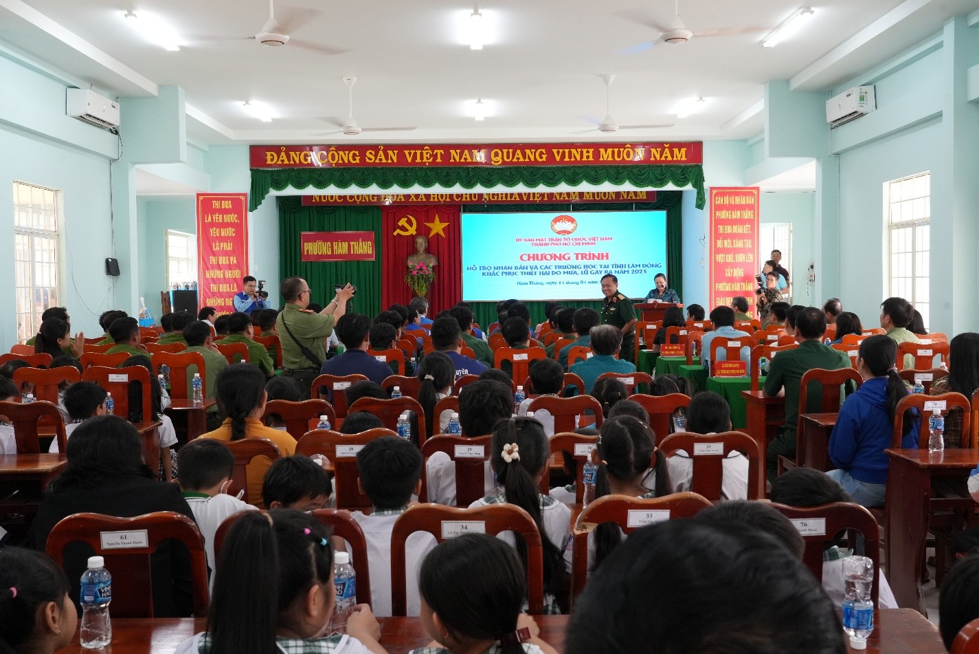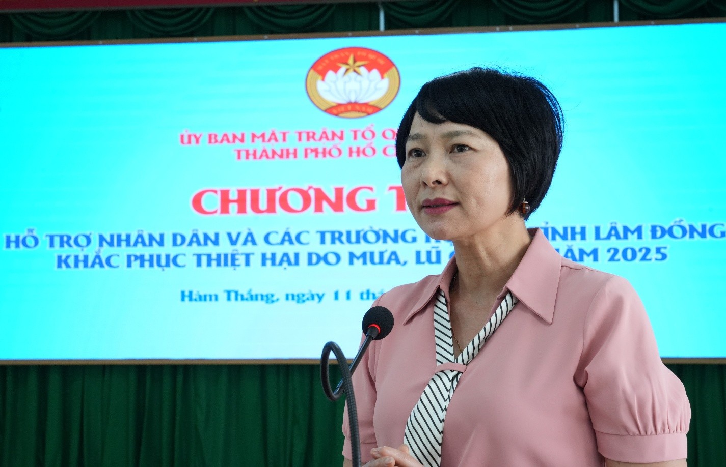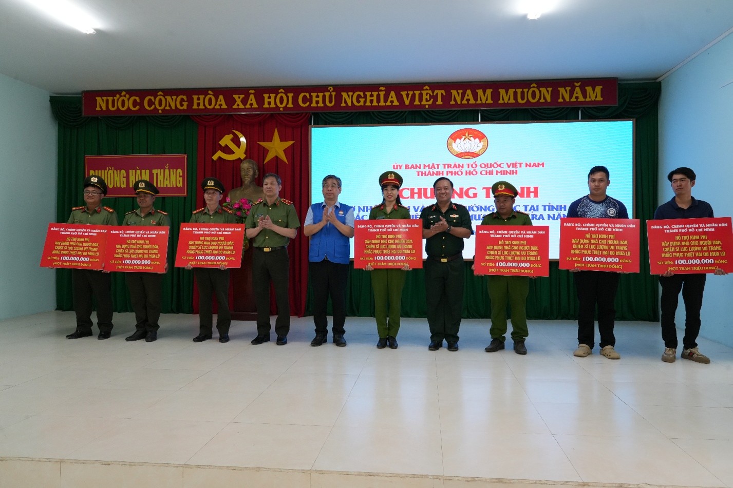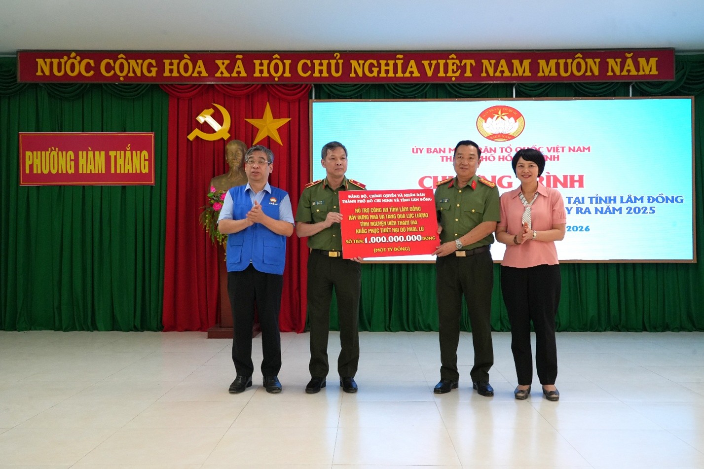 Tại chương trình, Đoàn công tác trao 10 tỷ đồng cho Ủy ban MTTQ Việt Nam tỉnh Lâm Đồng để triển khai hỗ trợ theo các nhóm đối tượng. Ngoài ra, hỗ trợ Công an tỉnh Lâm Đồng 1 tỷ đồng và Bộ CHQS tỉnh 500 triệu đồng để xây dựng nhà và tặng quà cho một số lực lượng, tình nguyện viên tham gia khắc phục thiệt hại do mưa, lũ; hỗ trợ 3 trường học trên địa bàn phường Hàm Thắng (Tiểu học Hàm Thắng 2, Mẫu giáo Phú Long, Trường Phổ thông Dân tộc Nội trú) mỗi trường 300 triệu đồng. Đặc biệt, chương trình hỗ trợ 7 hộ dân là cán bộ, chiến sĩ Công an và lực lượng dân quân tự vệ có nhà bị hư hỏng do mưa lũ, mỗi hộ 100 triệu đồng.