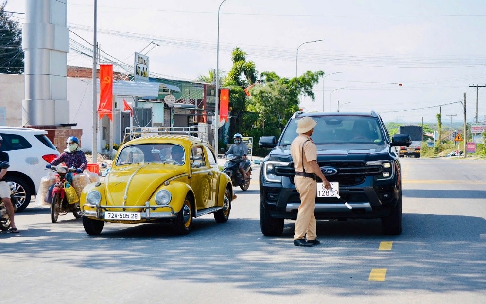 Lực lượng cán bộ, chiến sĩ Trạm CSGT Hàm Tân ra hiệu lệnh dừng xe phương tiện.