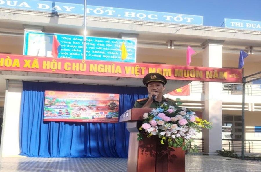 Cán bộ Công an xã Nam Đà tuyên truyền các nội dung về phòng, chống lừa đảo trực tuyến tại Trường THPT Trần Phú – Nam Đà