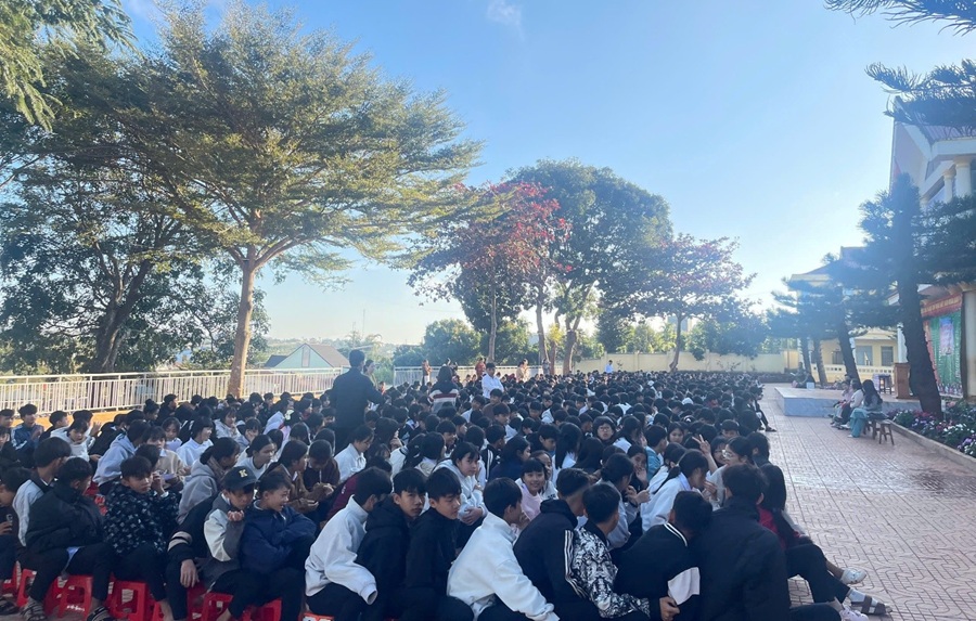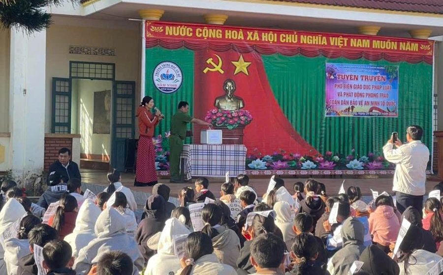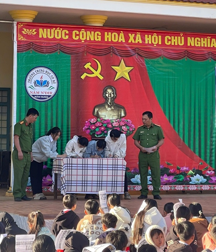 Tham dự buổi tuyên truyền có đại diện Chỉ huy Công an xã Nâm Nung, Ban Giám hiệu nhà trường cùng hơn 800 cán bộ, giáo viên và học sinh Trường THCS Nâm N’Đir.