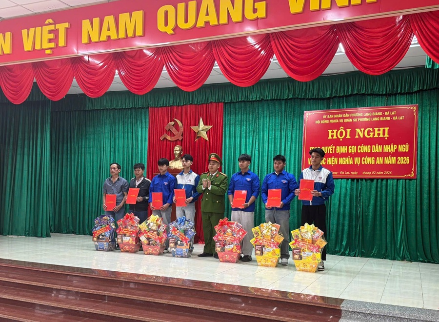 Tin tức - Sự kiệnHoạt động của Công an các đơn vị, địa phương Trao quyết định gọi công dân nhập ngũ năm 2026 tại phường Lang Biang – Đà Lạt Your browser does not support the audio element.   14/02/2026 15:02 |   19 |  Ngày 12/02/2026, tại Ban Chỉ huy quân sự phường Lang Biang – Đà Lạt, Hội đồng nghĩa vụ quân sự phường đã tổ chức Hội nghị trao Quyết định gọi công dân nhập ngũ vào Quân đội và công dân thực hiện nghĩa vụ tham gia Công an nhân dân năm 2026. Tham dự Hội nghị có đại diện Đảng ủy, HĐND, UBND phường, các ban, ngành, đoàn thể cùng gia đình và các công dân trúng tuyển. Tại Hội nghị, Ban tổ chức đã trao quyết định và tặng quà động viên 35 công dân nhập ngũ vào Quân đội và 07 công dân thực hiện nghĩa vụ tham gia Công an nhân dân năm 2026. Đại diện Ban Chỉ huy Công an phường trao quyết định và quà cho công dân thực hiện nghĩa vụ Công an nhân dân Kết quả Hội nghị thể hiện sự phối hợp chặt chẽ giữa Công an phường với Ban Chỉ huy quân sự và các ban, ngành, đoàn thể trong công tác tuyên truyền, tuyển chọn công dân bảo đảm đúng quy định, hoàn thành chỉ tiêu được giao. Hội nghị chụp hình lưu niệm Các công dân trúng tuyển là niềm tự hào của gia đình và địa phương, đồng thời thể hiện quyết tâm rèn luyện, phấn đấu hoàn thành tốt nhiệm vụ được giao, góp phần xây dựng và bảo vệ Tổ quốc. Công an phường Lang Biang – Đà Lạt Từ khóa Liên kết Công an phường Lang Biang – Đà Lạt