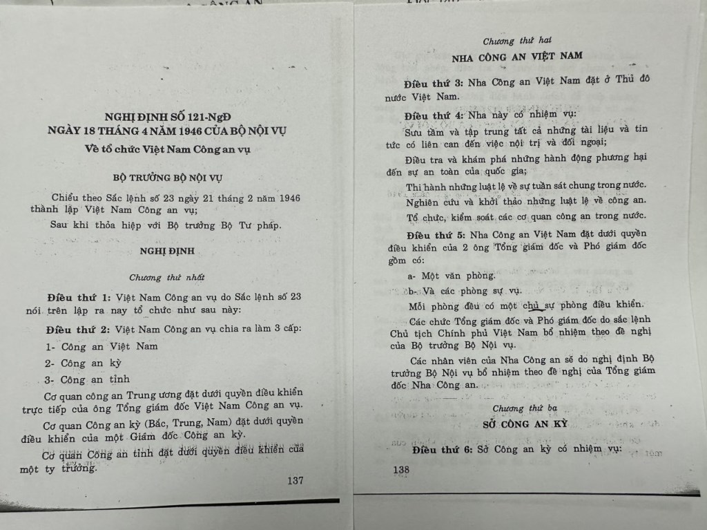 Trích vắn tắt một số nội dung Nghị định 121-NgĐ ngày 18/4/1946 của Bộ Nội vụ về tổ chức Việt Nam Công an vụ