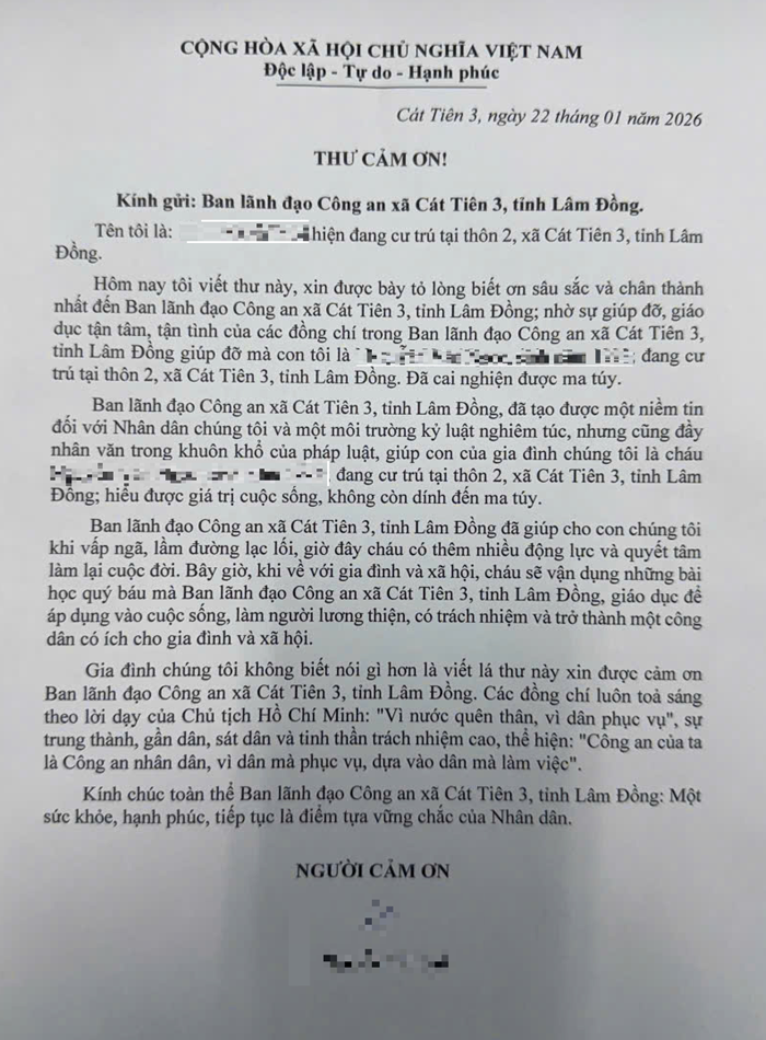 Xúc động trước sự quan tâm, hỗ trợ tận tình, trách nhiệm và đầy tính nhân văn của lực lượng Công an xã Cát Tiên 3, ngày 22/01/2026, anh N cùng gia đình đã trực tiếp đến trụ sở Công an xã gửi thư cảm ơn, bày tỏ lòng biết ơn sâu sắc đối với tập thể cán bộ, chiến sĩ.