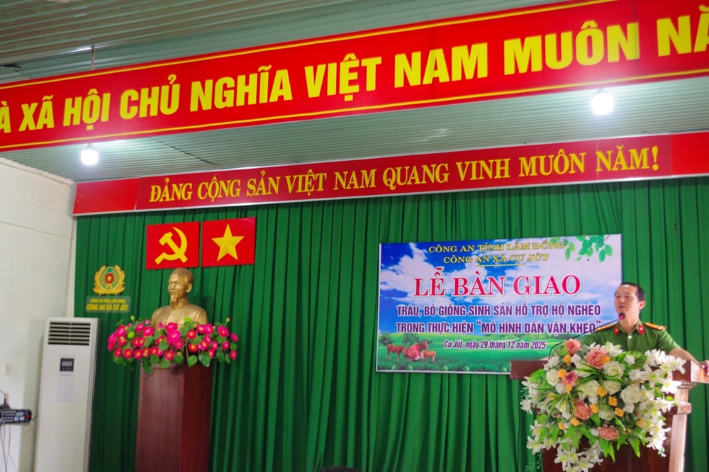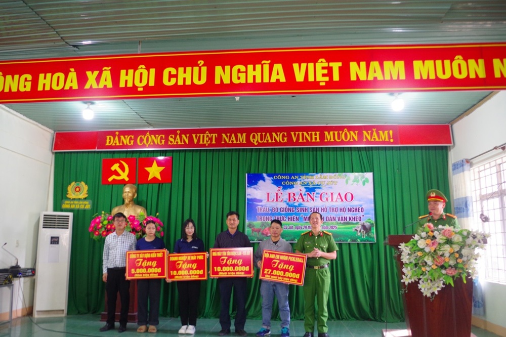 Tiếp nối hiệu quả bước đầu, ngày 29 tháng 12 năm 2025, Công an xã Cư Jút tiếp tục đẩy mạnh công tác xã hội hóa, vận động các mạnh thường quân hỗ trợ và trao tặng thêm 03 con bò giống sinh sản cho 03 hộ dân nghèo thuộc thôn 11 và thôn 12 Cư Knia. Tính đến thời điểm hiện tại, mô hình đã đạt tổng số 07 con bò và 02 con bê con, bước đầu ghi nhận hiệu quả rõ nét về kinh tế và ý nghĩa xã hội. Qua hoạt động này, vai trò cầu nối của lực lượng Công an trong việc huy động nguồn lực xã hội nhằm chăm lo đời sống nhân dân tiếp tục được khẳng định.