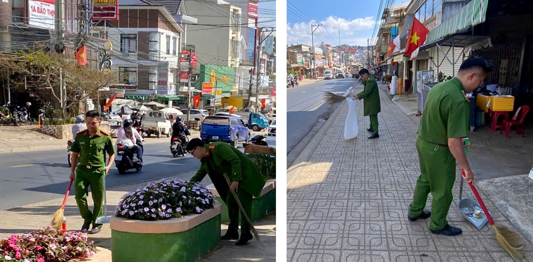 Hình ảnh những chiến sĩ công an trẻ tuổi quét dọn, nhặt rác giữa nắng sớm