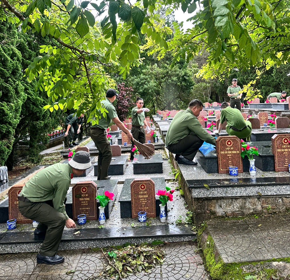 Phát huy tinh thần xung kích, tình nguyện vì cộng đồng, sáng các ngày 24 và 26/7/2025, đoàn viên thanh niên Công an tỉnh đã đồng loạt ra quân chỉnh trang, vệ sinh môi trường tại các Nghĩa trang Liệt sĩ trên địa bàn: Đà Lạt, Bình Thuận, Đắk Nông. Các đoàn viên đã dọn dẹp vệ sinh, quét lá, cắt cỏ, chăm sóc và thay hoa tại các phần mộ liệt sĩ. Những việc làm tuy nhỏ nhưng mang ý nghĩa lớn, góp phần tạo cảnh quan khang trang, trang nghiêm tại nơi yên nghỉ của các anh hùng liệt sĩ.