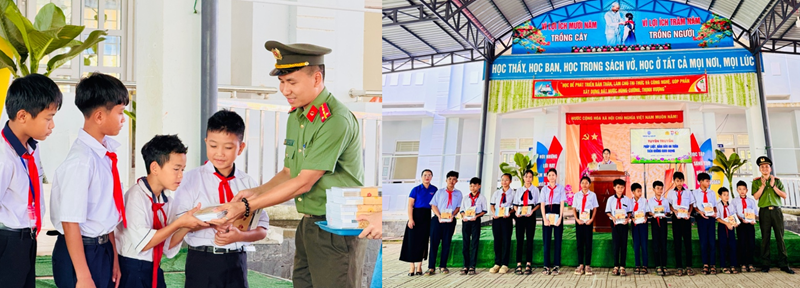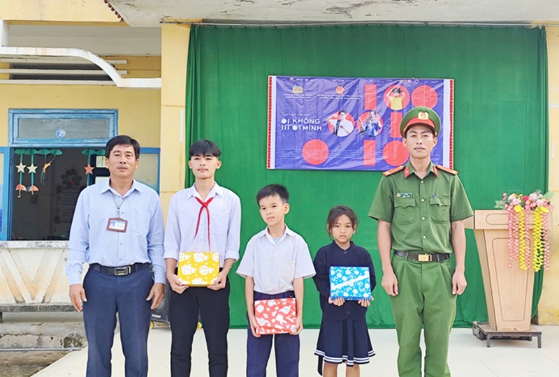 Công an xã tặng quà cho các em học sinh trả lời đúng câu hỏi