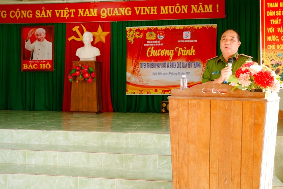 Tại buổi tuyên truyền, Trung tá Nguyễn Danh Tuyên, Trưởng Công an xã Suối Kiết đã trực tiếp phổ biến đến bà con Nhân dân nhiều nội dung pháp luật thiết thực, tập trung vào các quy định về trật tự, an toàn giao thông; phòng, chống ma túy; quản lý, sử dụng vũ khí, công cụ hỗ trợ, vật liệu nổ; cũng như các phương thức, thủ đoạn trộm cắp, lừa đảo thường xảy ra trong dịp giáp Tết, qua đó giúp người dân nâng cao cảnh giác, chủ động phòng ngừa tội phạm.