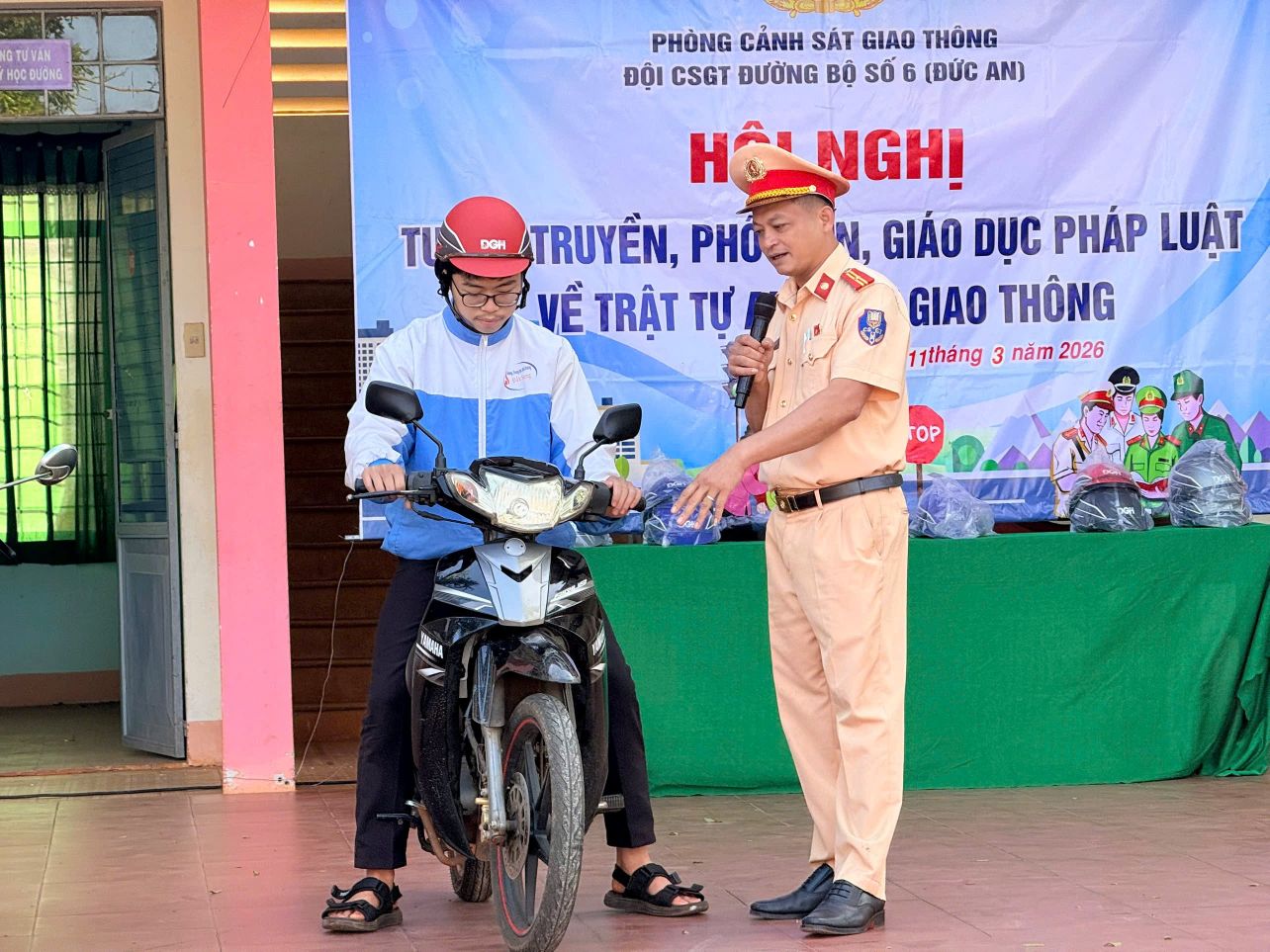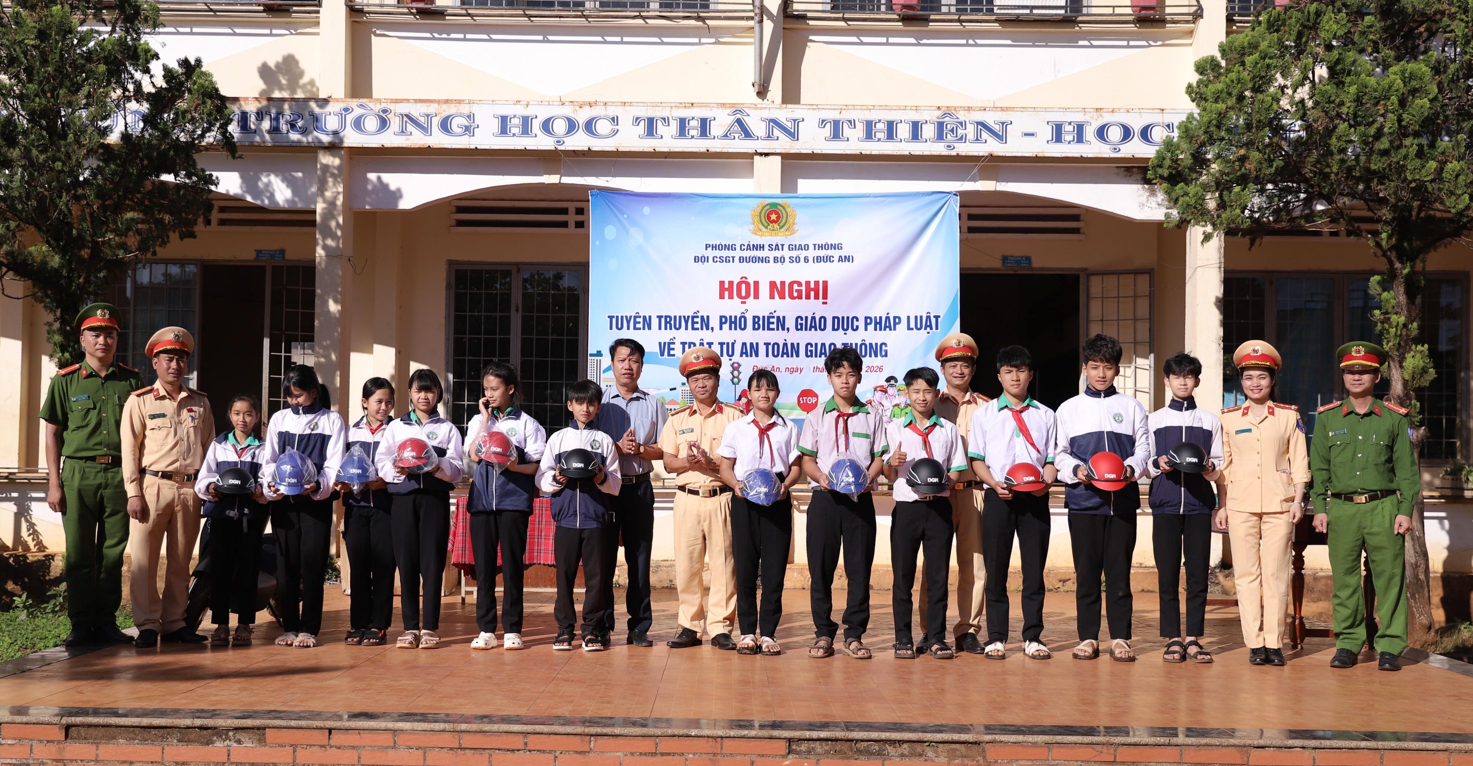 Đội CSGT đường bộ số 6 – Đức An tặng mũ bảo hiểm cho các em học sinh