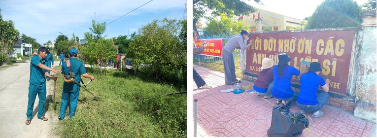 Cán bộ khối Đảng, Mặt trận Tổ quốc Việt Nam, các đoàn thể chính trị – xã hội, lực lượng dân quân, Thanh niên tình nguyện, vệ sinh chỉnh trang bia ghi danh liệt sĩ