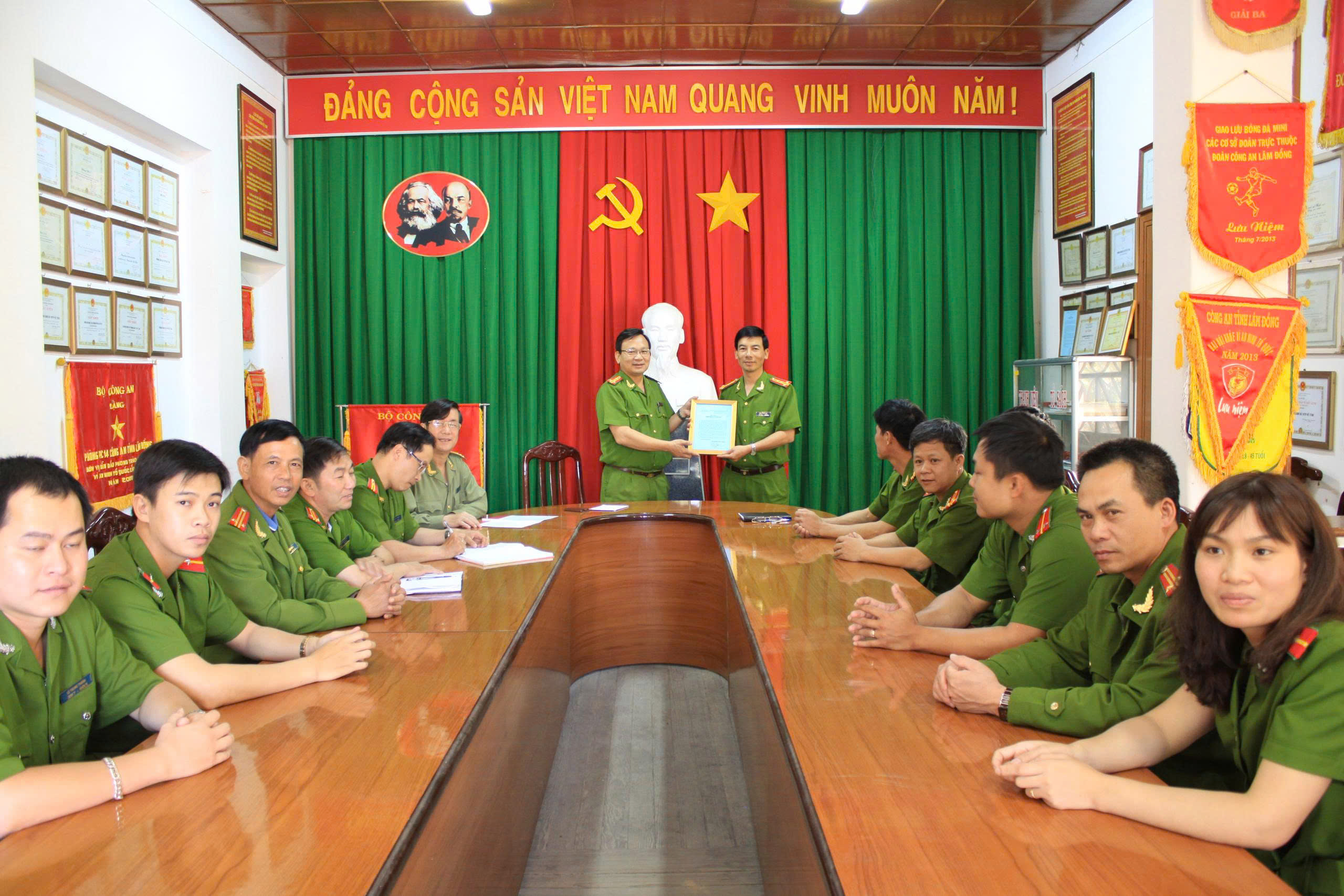 Đại tá Vũ Nhân Khánh – Nguyên Tỉnh ủy viên, Nguyên Phó Giám đốc CAT trao thư khen của Giám đốc CAT cho phòng Cảnh sát hình sự về thành tích khám phá nhanh nhiều vụ trọng án.