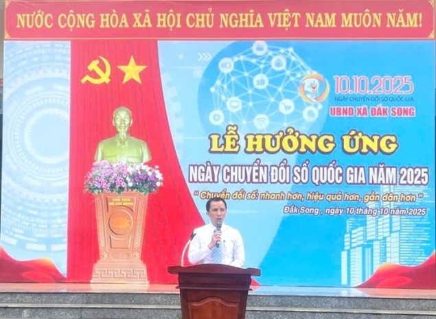 Phát biểu tại buổi lễ, đồng chí Mai Trần Anh, Phó Chủ tịch UBND xã Đắk Song cho biết: “Với phương châm ‘Chuyển đổi số là động lực cho sự phát triển của địa phương’, thời gian qua, xã Đắk Song đã triển khai đồng bộ, quyết liệt nhiều giải pháp trong công tác chuyển đổi số và đạt được nhiều kết quả quan trọng. Xã đã đưa vào vận hành hệ thống một cửa điện tử, phần mềm quản lý văn bản và điều hành, ứng dụng chữ ký số giúp giảm hơn 40% thời gian xử lý hồ sơ hành chính; 100% cán bộ, công chức được tập huấn kỹ năng số, sử dụng thành thạo các nền tảng trực tuyến trong điều hành, xử lý công việc; người dân được hướng dẫn sử dụng dịch vụ công trực tuyến toàn trình, góp phần giảm trung bình 30% thời gian đi lại, hạn chế tiếp xúc trực tiếp và nâng cao tính minh bạch.”