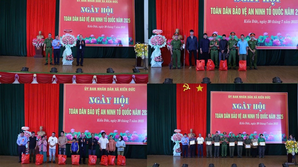Dịp này, lãnh đạo UBND xã, Công an xã Kiến Đức đã tặng quà cho 4 cá nhân tự nguyện giao nộp Vũ khí, vật liệu nổ, công cụ hỗ trợ. Tặng quà cho 8 hộ gia đình có hoàn cảnh khó khăn và khen thưởng 2 tập thể và 9 cá nhân vì có thành tích xuất sắc trong phong trào Toàn dân bảo vệ ANTQ năm 2025.
