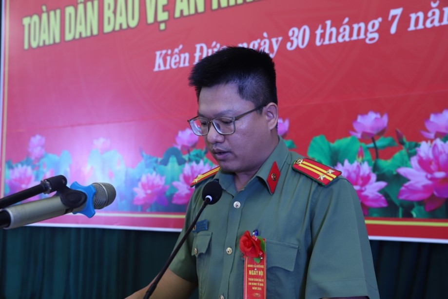 Đồng chí Trung tá Trần Văn Chung, phó Trưởng Công an xã Kiến Đức phát biểu.