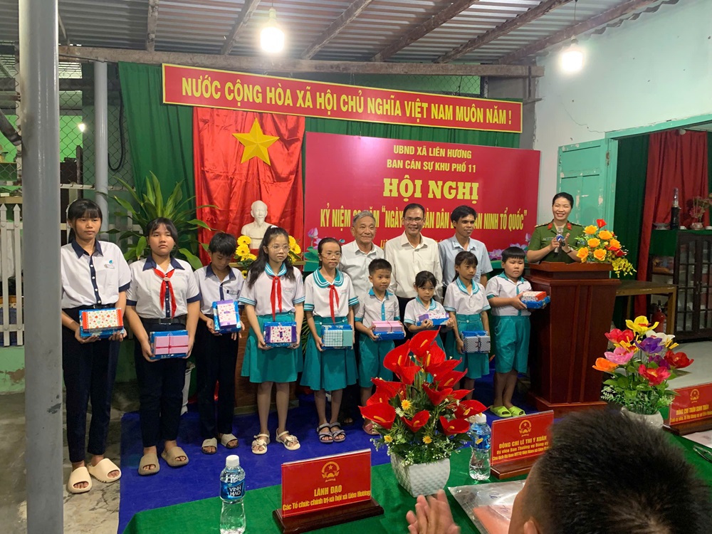 Lãnh đạo Đảng uỷ, UBND xã Liên Hương, Ban Cán sự Khu phố 11 trao quà cho các em học sinh nghèo vượt khó