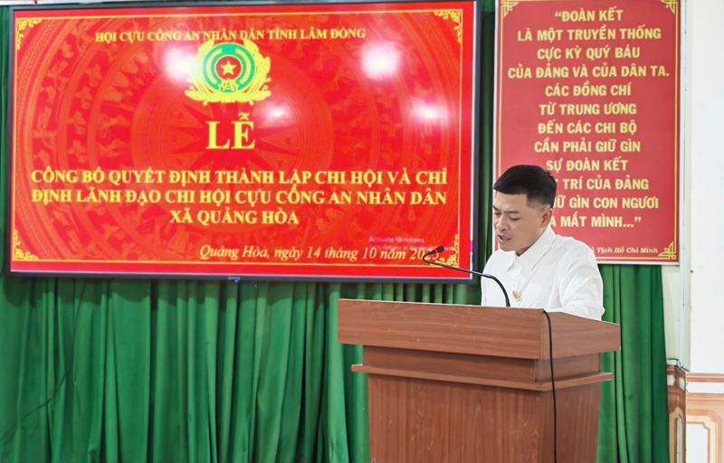 Tại buổi lễ, đại diện Hội Cựu Công an nhân dân tỉnh Lâm Đồng đã công bố và trao Quyết định thành lập Chi hội Cựu Công an nhân dân xã Quảng Hòa, chỉ định Ban Chấp hành lâm thời gồm 11 hội viên. Đồng chí Vi Văn Thuộc (nguyên Trưởng Công an xã Quảng Hòa) được chỉ định làm Chi hội trưởng. Việc thành lập Chi hội nhằm tập hợp, đoàn kết các đồng chí nguyên là cán bộ, chiến sĩ Công an đã nghỉ hưu, thôi công tác nhưng vẫn giữ vững phẩm chất cách mạng, tinh thần “Vì nước quên thân, vì dân phục vụ”.