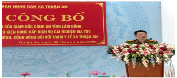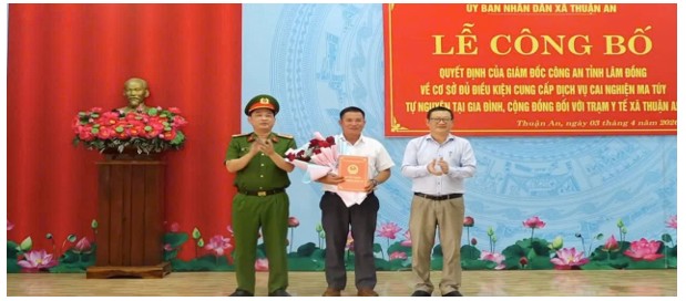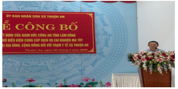 Tại buổi lễ, đồng chí Thượng tá Lê Khả Vân và đồng chí Phan Bá Tịnh đã trao Quyết định công nhận Trạm Y tế xã Thuận An là cơ sở đủ điều kiện cung cấp dịch vụ cai nghiện ma túy tự nguyện tại gia đình và cộng đồng. Việc công nhận tạo điều kiện để địa phương chủ động triển khai các biện pháp tư vấn, điều trị, hỗ trợ và quản lý người nghiện ma túy, góp phần nâng cao hiệu quả công tác phòng, chống ma túy tại cơ sở.